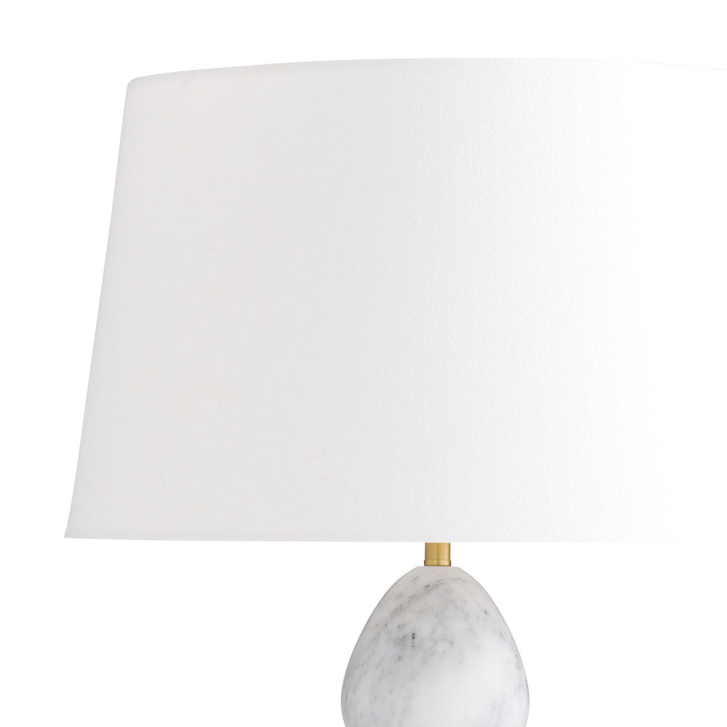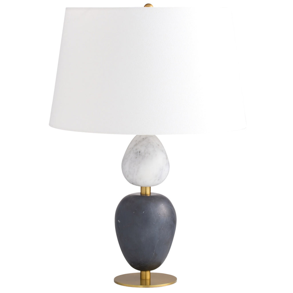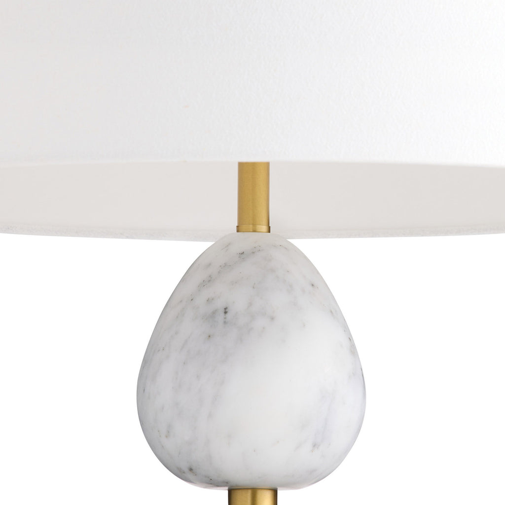 Defined by architectural elements and natural materials, the Aubrey is a showpiece. The new combination of gray flower and black marble wraps an ovoid form around an antique brass steel frame. Topped with an off-white linen shade with cotton lining and an antique brass steel sphere finial—finish will vary.