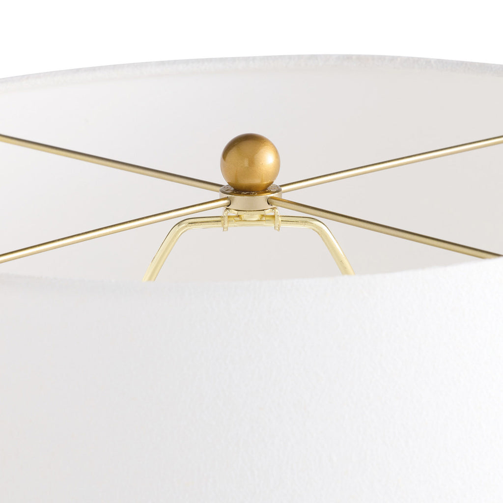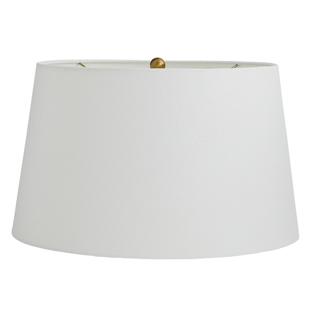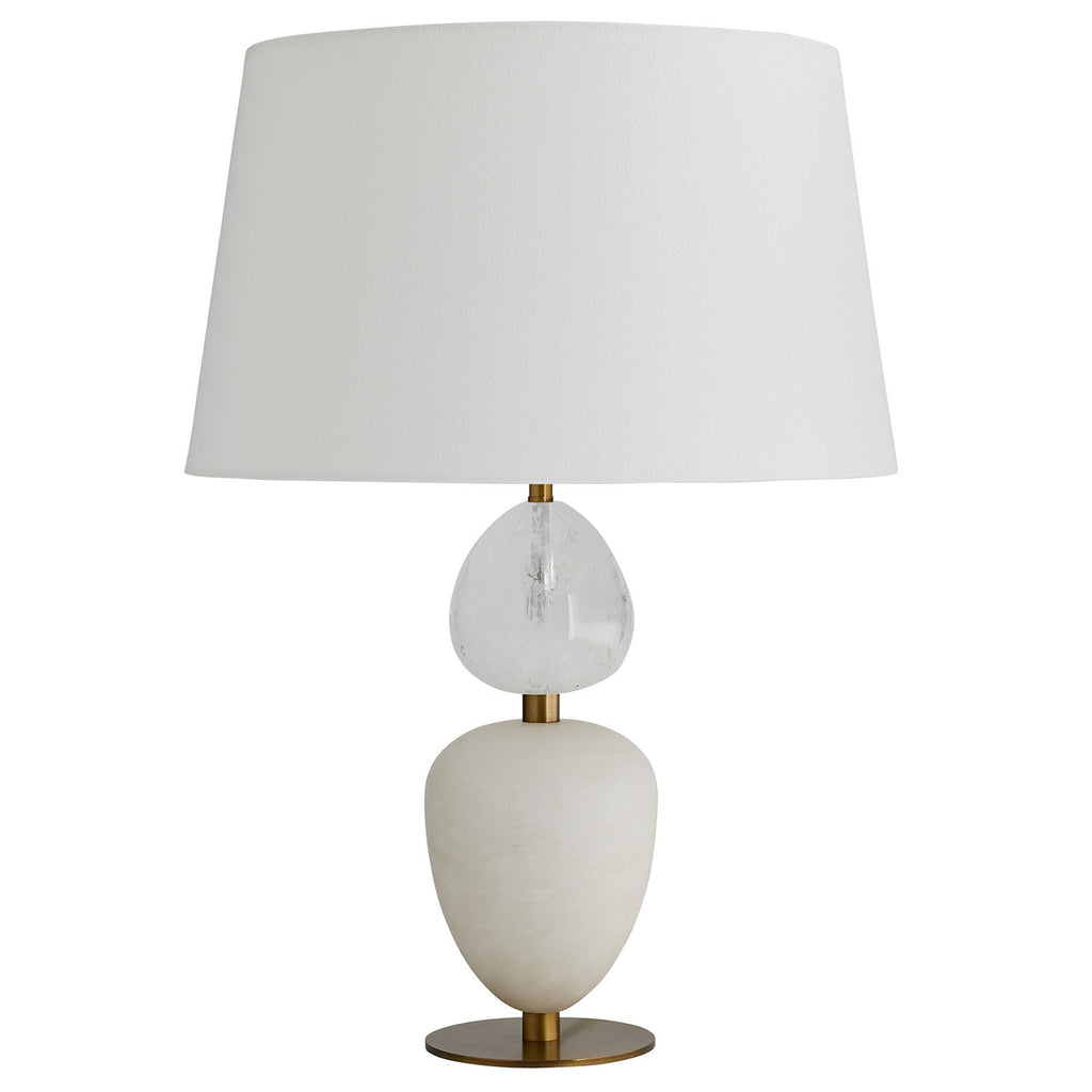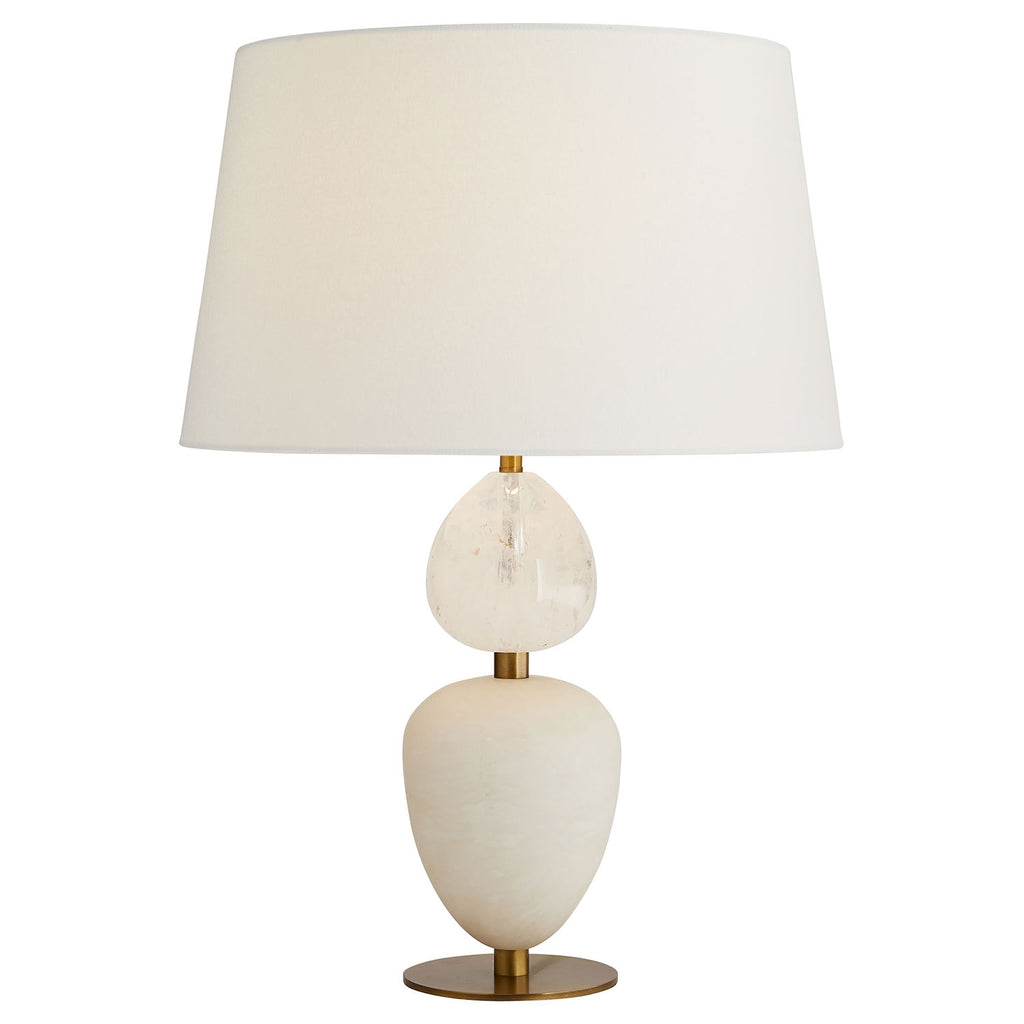 Defined by architectural elements and natural materials, the Aubrey is a showpiece. The new combination of gray flower and black marble wraps an ovoid form around an antique brass steel frame. Topped with an off-white linen shade with cotton lining and an antique brass steel sphere finial—finish will vary.