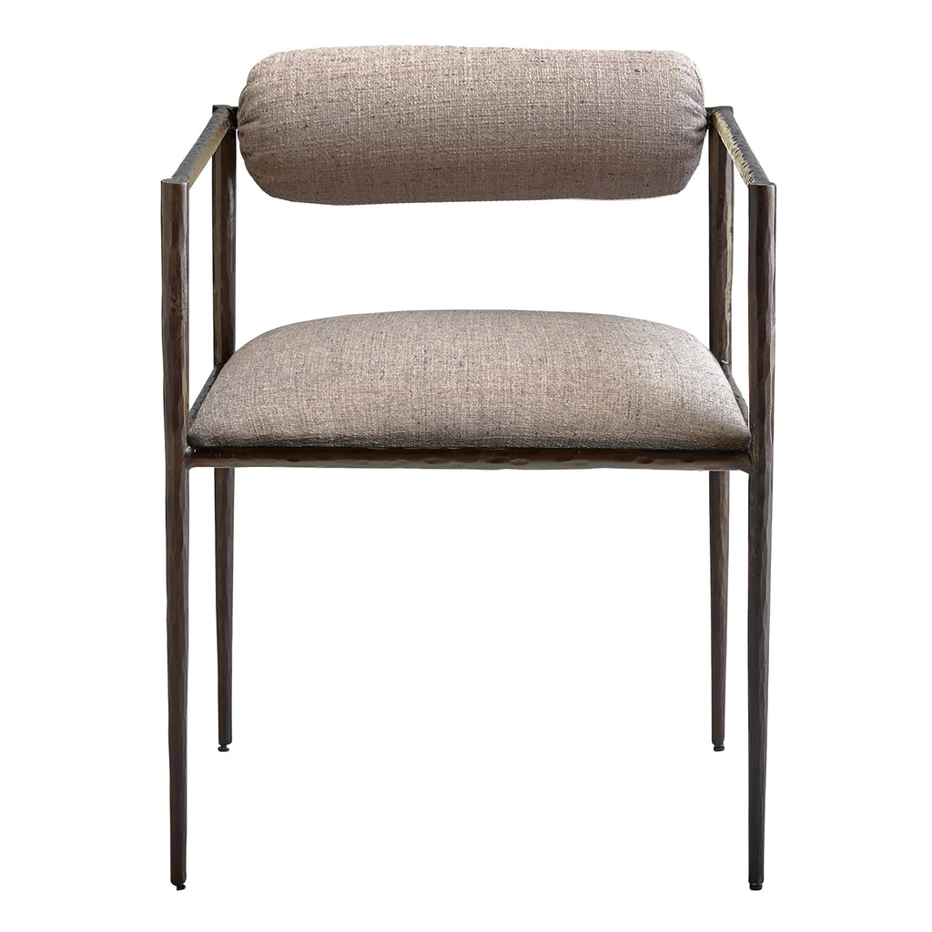 This exquisite frame is perfectly poised, perched on delicate legs that are as faint as insects’. The natural iron body is hand-forged, yielding soft impressions along the sharp-angled frame. The tight seat and bolster back cushion are covered in a textured pewter poly-blend fabric—finish will vary.
