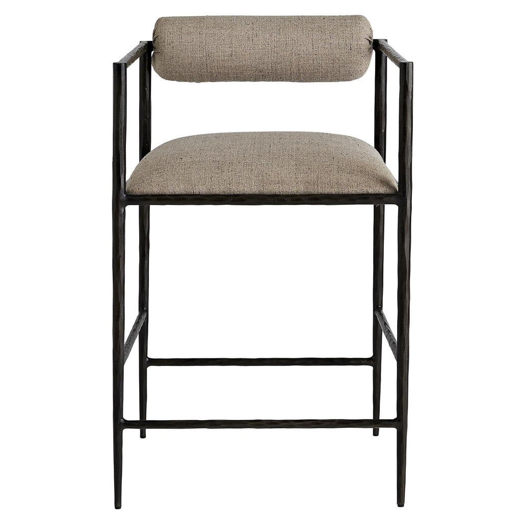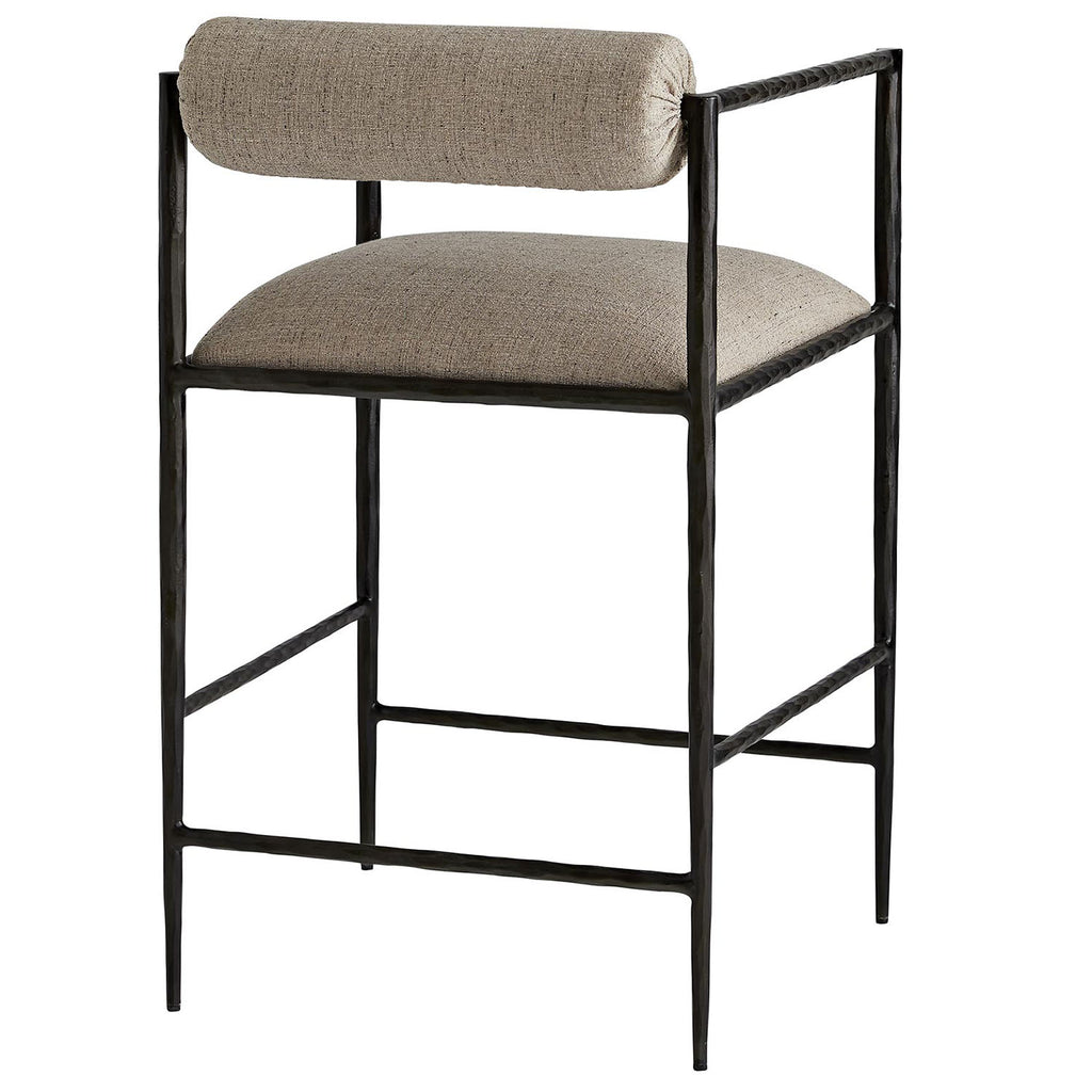 This exquisite stool is perfectly poised, perched on delicate legs that are as faint as insects'. The natural iron body has been hand-forged, yielding soft impressions along the sharp-angled frame. The tight seat and bolster back cushion are covered in a luxuriously textured pewter poly-blend. Finish may vary. Also available in bar height (4709) and as a chair (4543).