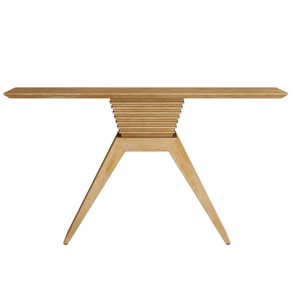 We've reinvented french art deco design for the 21st century with our streamlined Arteriors Barron Console Table. A cantilevered carved top of cerused white cedar balances precisely on tapered legs to dramatic effect. It is enhanced with pyramid-style carved details at its supportive center. Finish will vary.