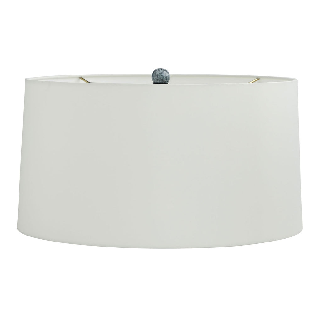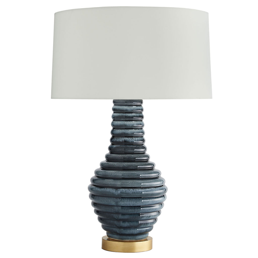 The Bartoli creates a brilliantly illuminated mise-en-scène with a barrel-like silhouette, featuring ridged Amalfi reactive glaze porcelain and a gold-leafed circular wooden base. It's topped with an ivory microfiber drum shade with off-white cotton lining and matching porcelain finial—finish will vary.