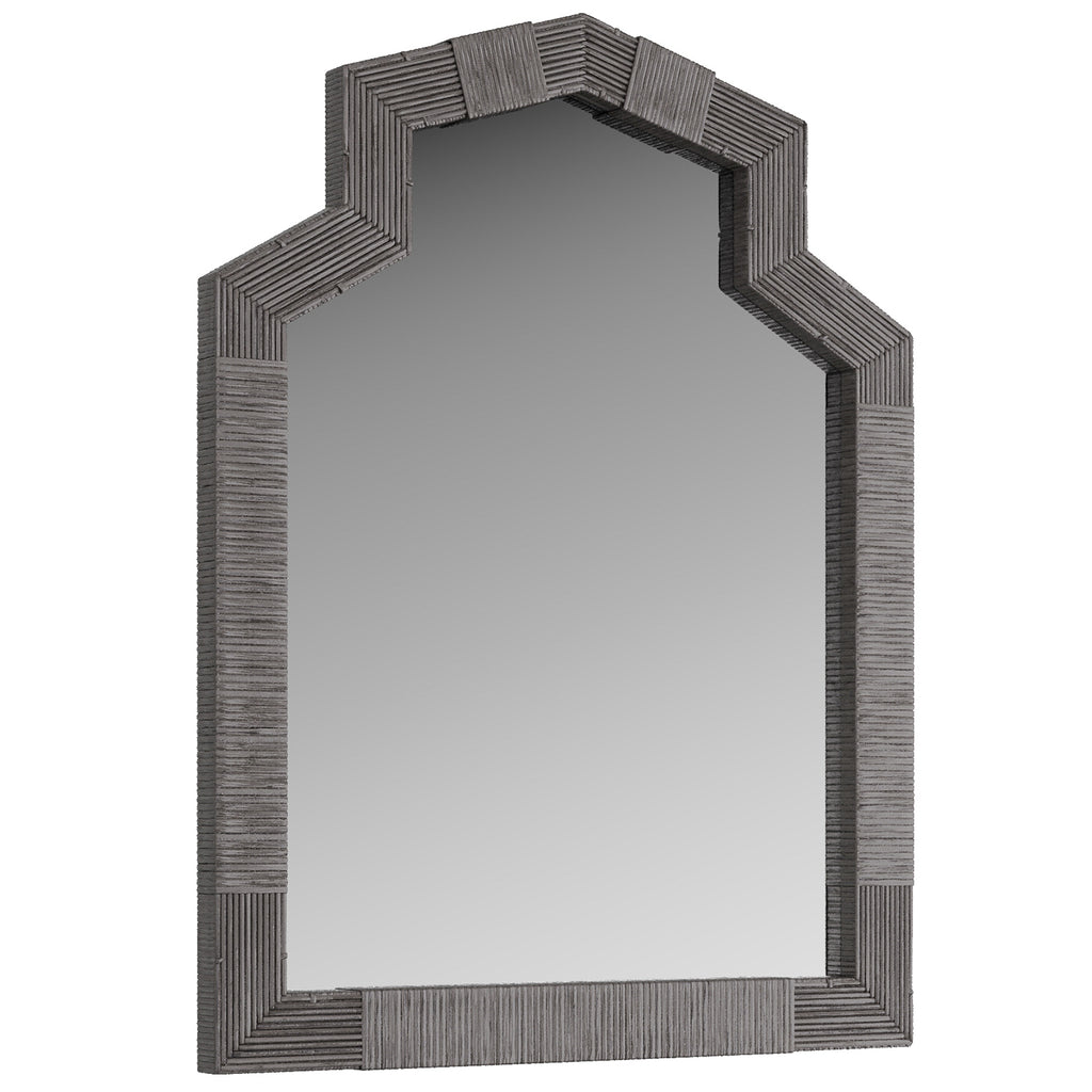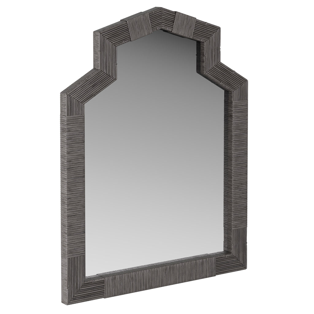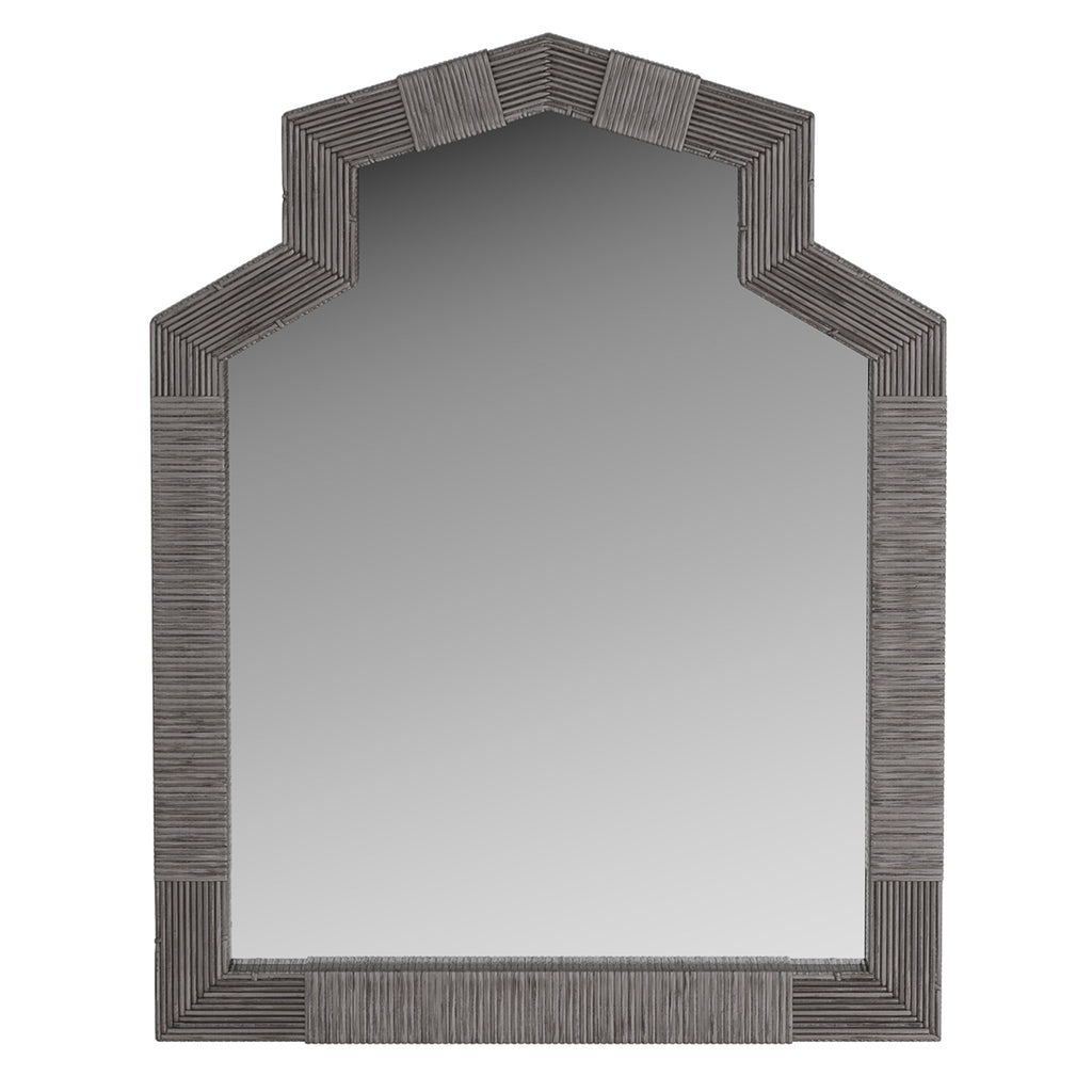 A classic greek geometric arch frame is wrapped in black-washed rattan. A mix of vertical and horizontal patterns draw the eye to this simplistic—yet no less impactful—style. Designed to be hung vertically, it is stabilized with a security cleat. Finish will vary.