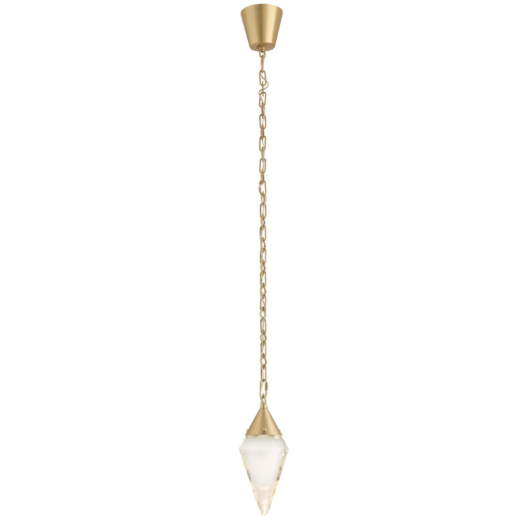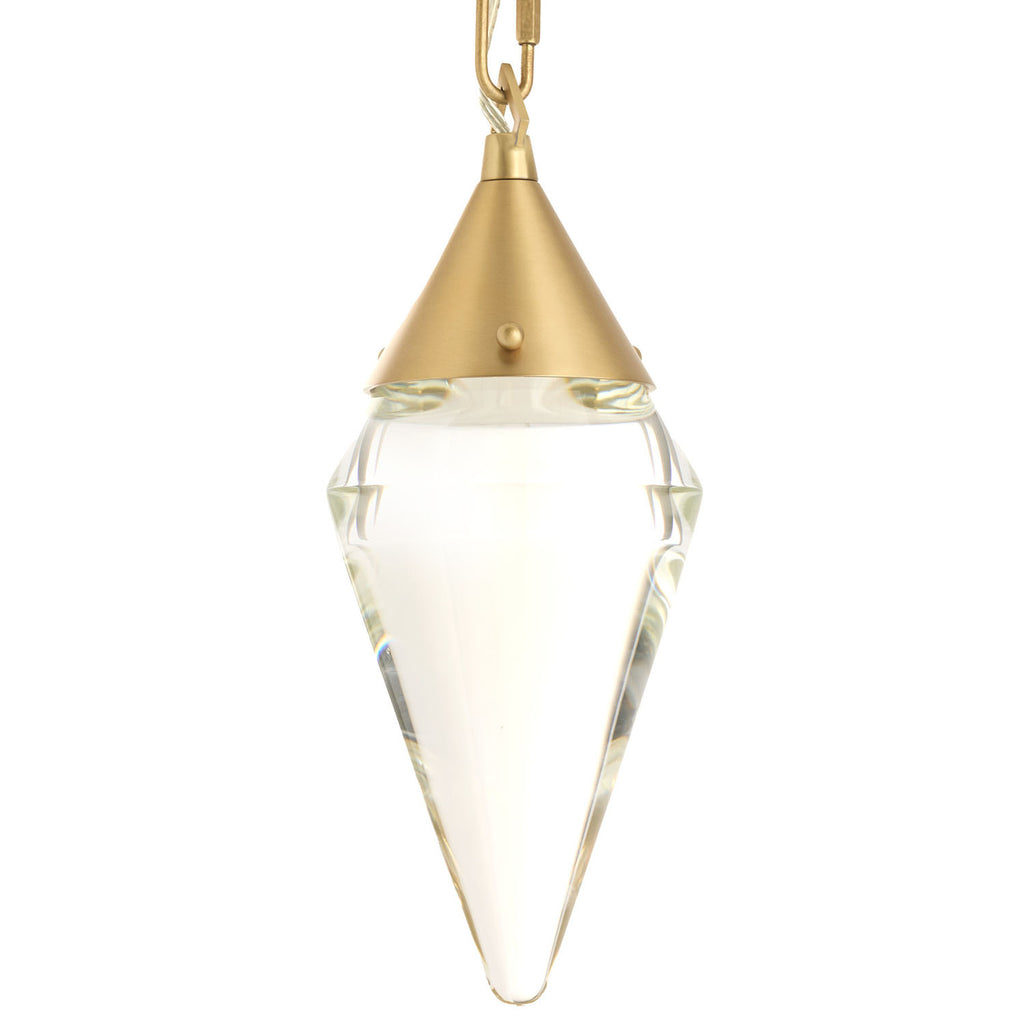 The foundation of this piece is a solid clear crystal diffuser stylishly suspended by an antique brass chain featuring an alternating diamond-to-oval pattern, complemented by a concealed LED that emits a soft illuminating glow. Damp-rated with limitations for covered outdoor conditions—finish will vary.