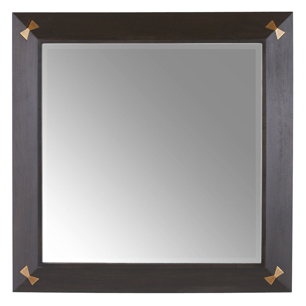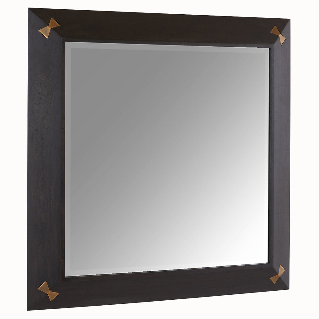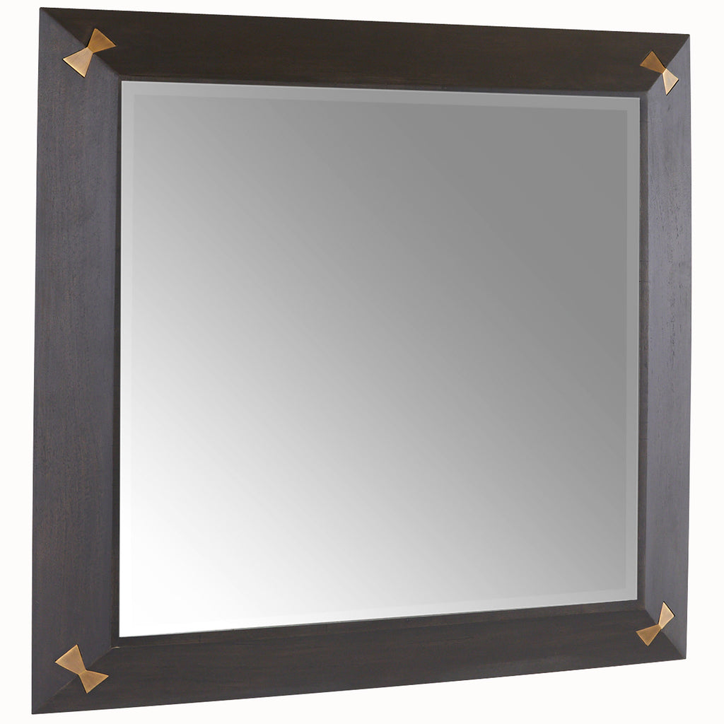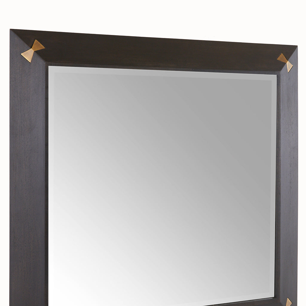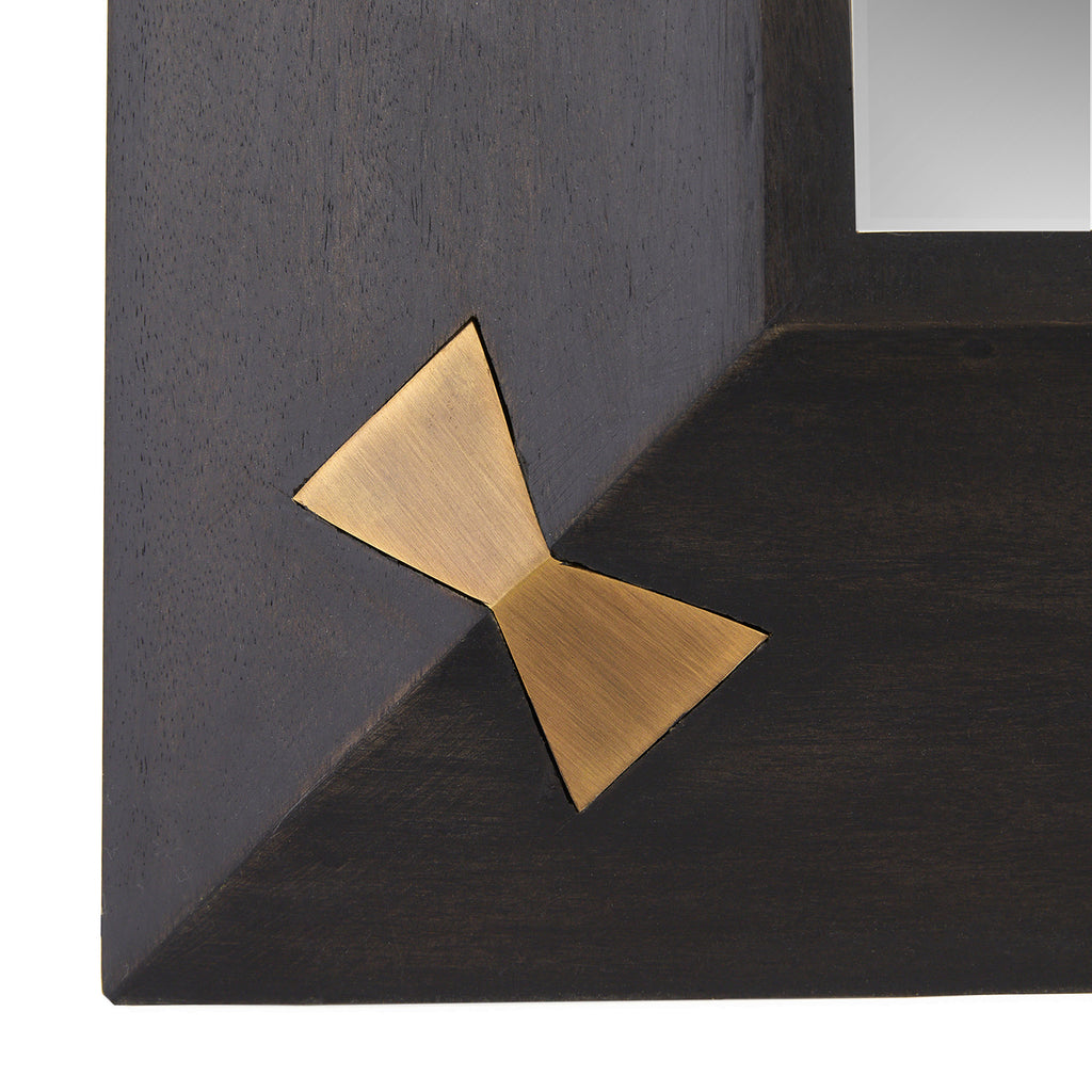 A polished sable mango wood frame is adorned with inlaid butterflies of antique brass to catch the light. The beveled mirror is held securely with dovetail joints, while each hinge lies flush within the frame for a smooth finish. Designed to be hung vertically, it is secured with a cleat at the back. Finish will vary.