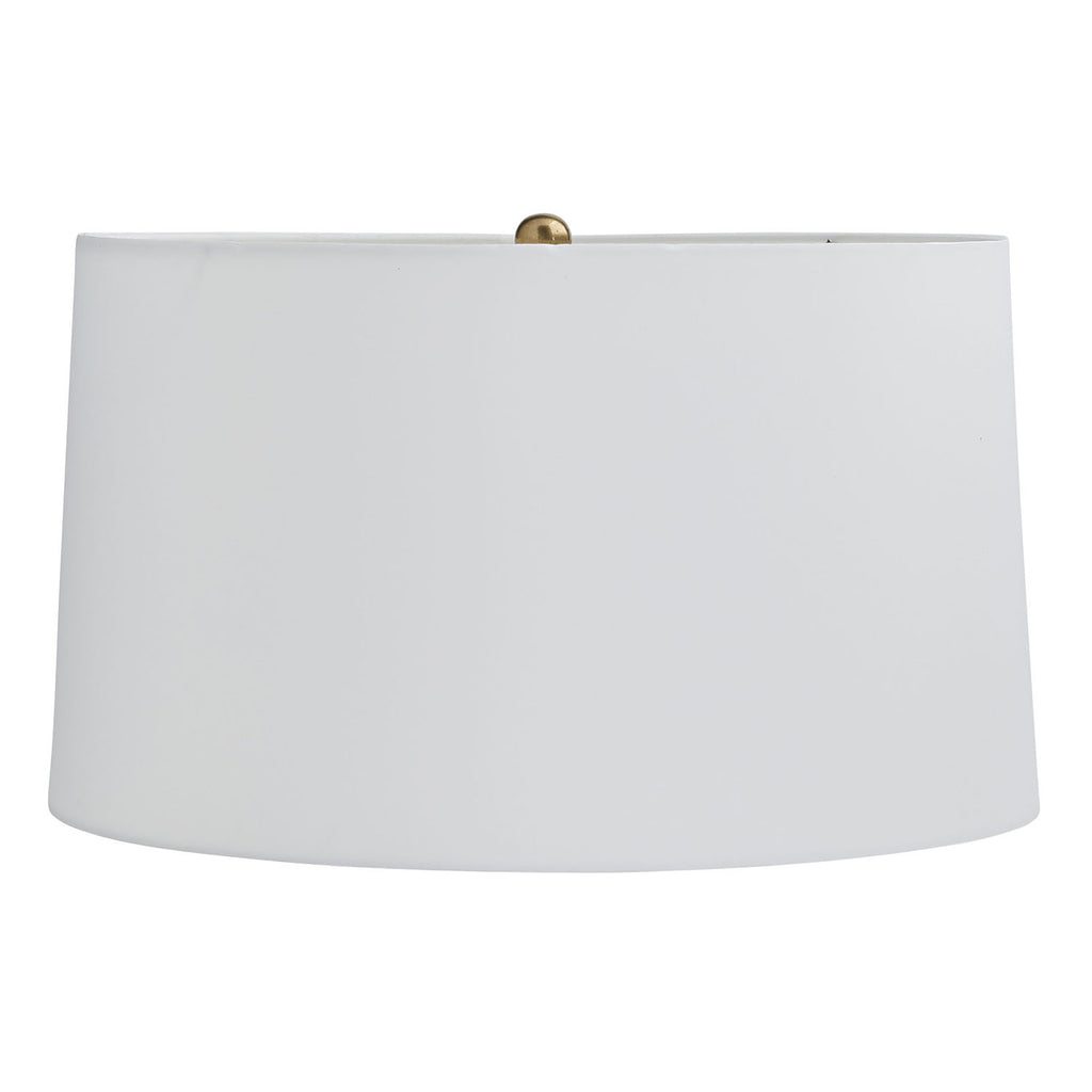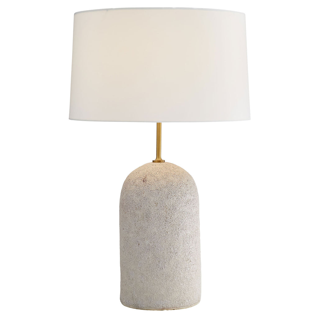 Finding a balance between raw and refined materials, this lamp establishes an inherent presence. A sleek antique brass iron stem supports a half-capsule ceramic base with ivory volcanic glaze, topped with an off-white microfiber drum shade and brass sphere finial—finish will vary.