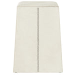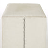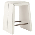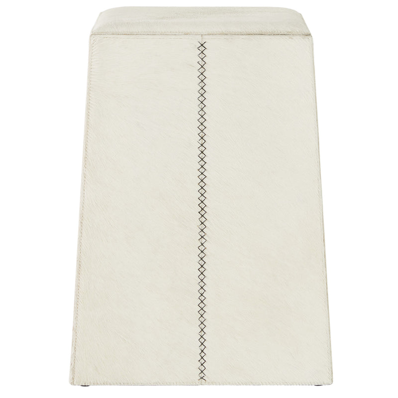 Crafted of white hair-on-hide, this backless counter stool is a tactile delight. A mitered whipstitch creates a racing stripe down the center of each side, while slim antique brass bridges add contrast and support to this minimal design. Hide will vary.