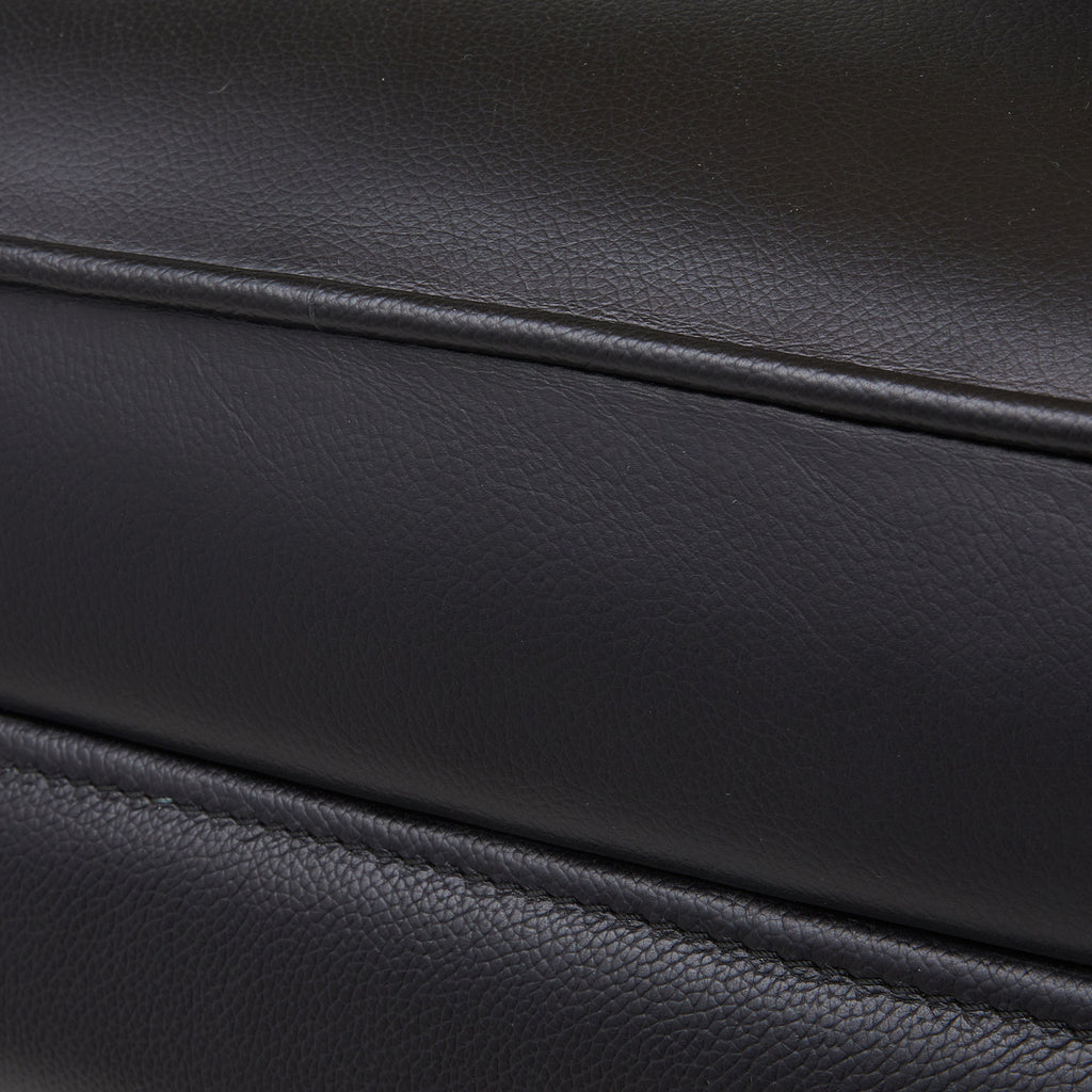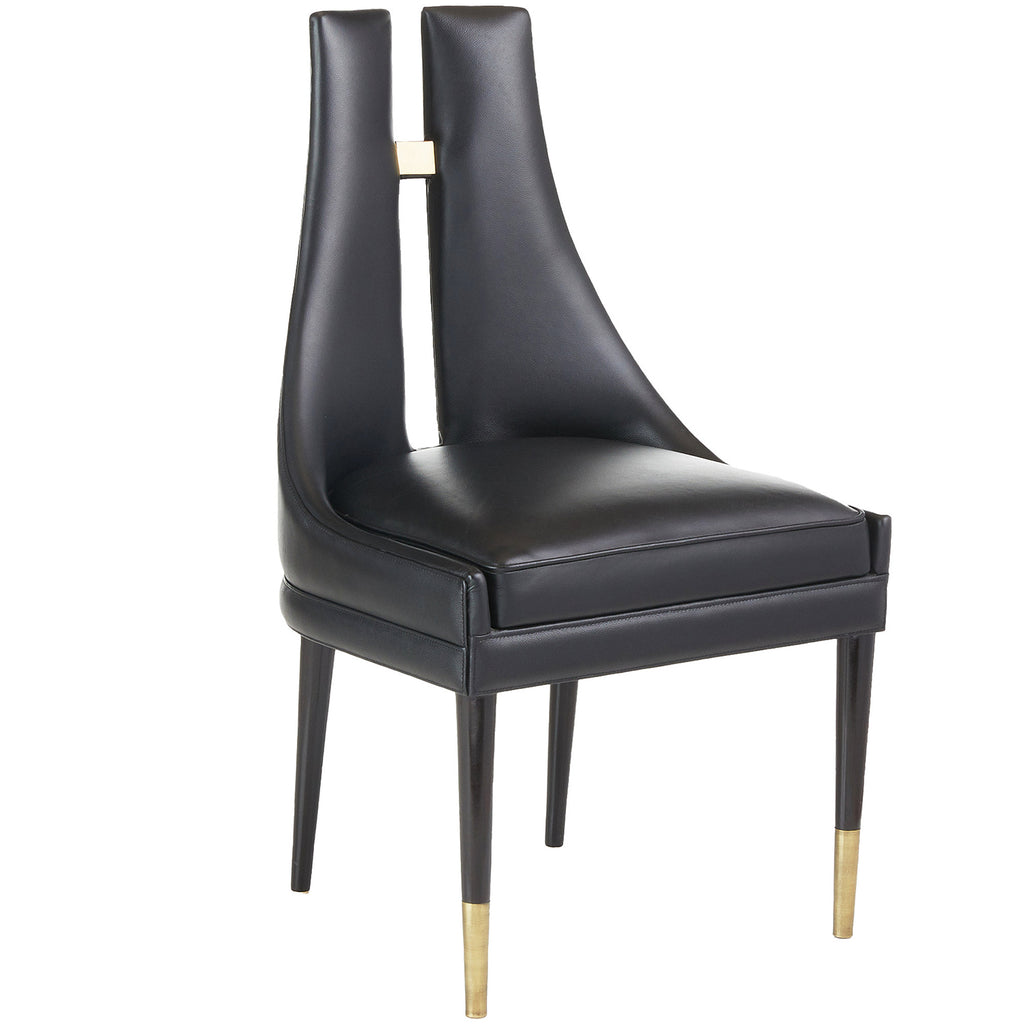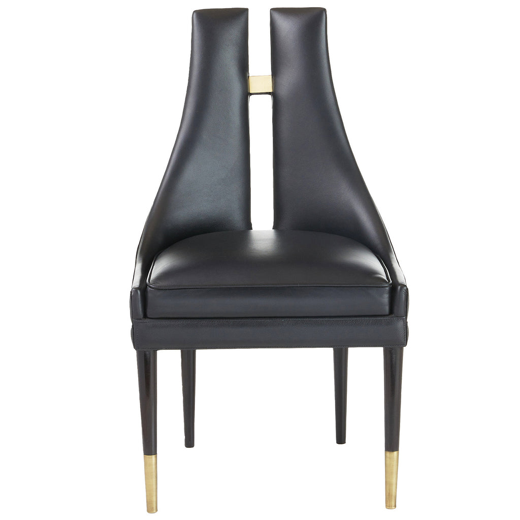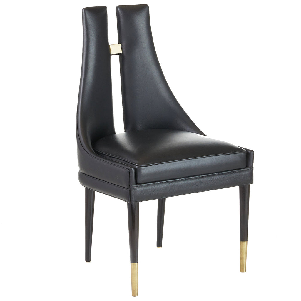 The ideal balance of masculine and feminine, a sleek slit detail mimics an alluring open-backed dress. Soft black leather upholstery is enhanced with polished antique brass joinery. Poised on slim, ebony beech wood legs tipped in brass. Leather will vary.