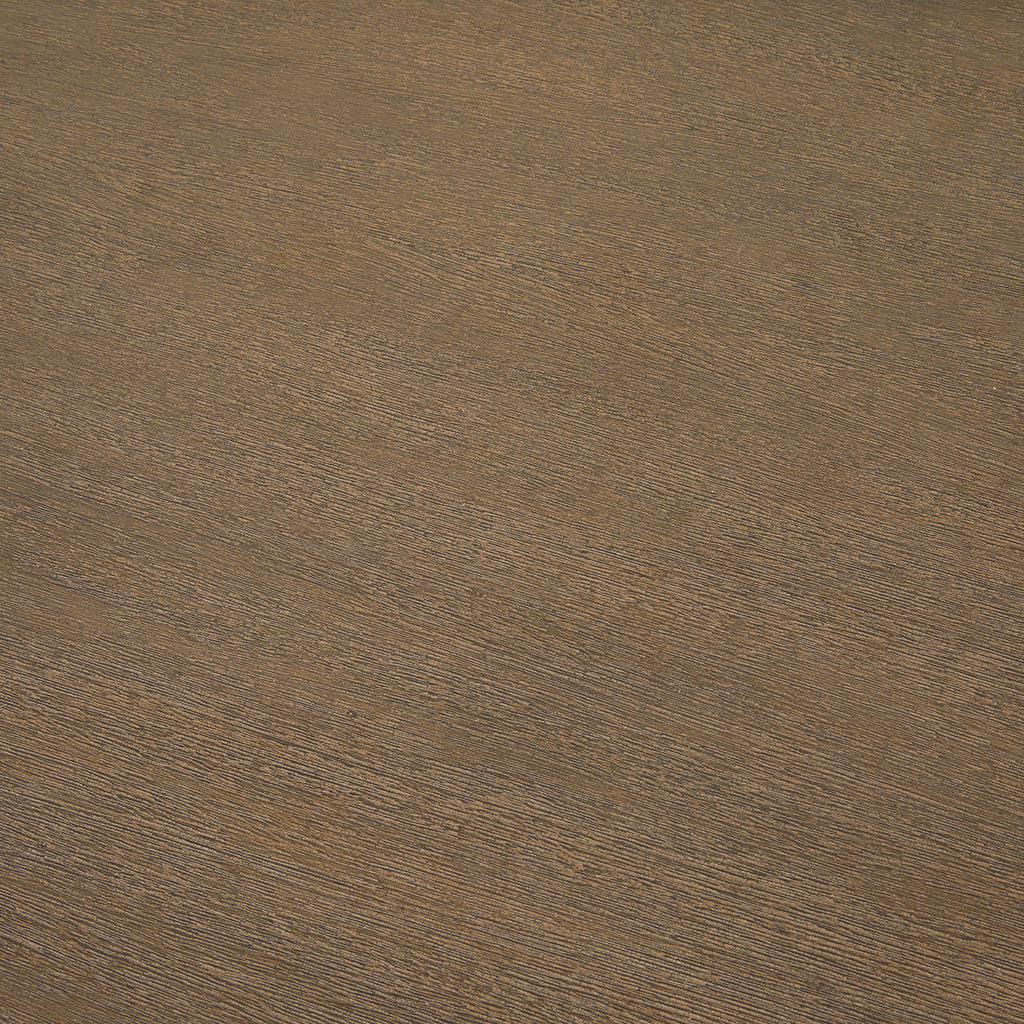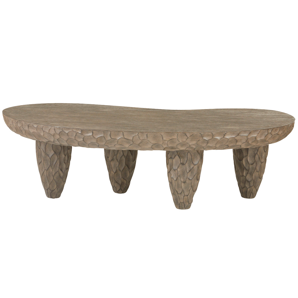 A traditional kidney-shaped table is reinvented in kona stained teak wood with a dramatic carved texture. Smooth on the top surface, it is adorned with over-scaled gauging details around the perimeter and on each substantial, conical leg. Finish will vary.