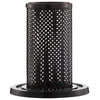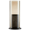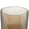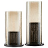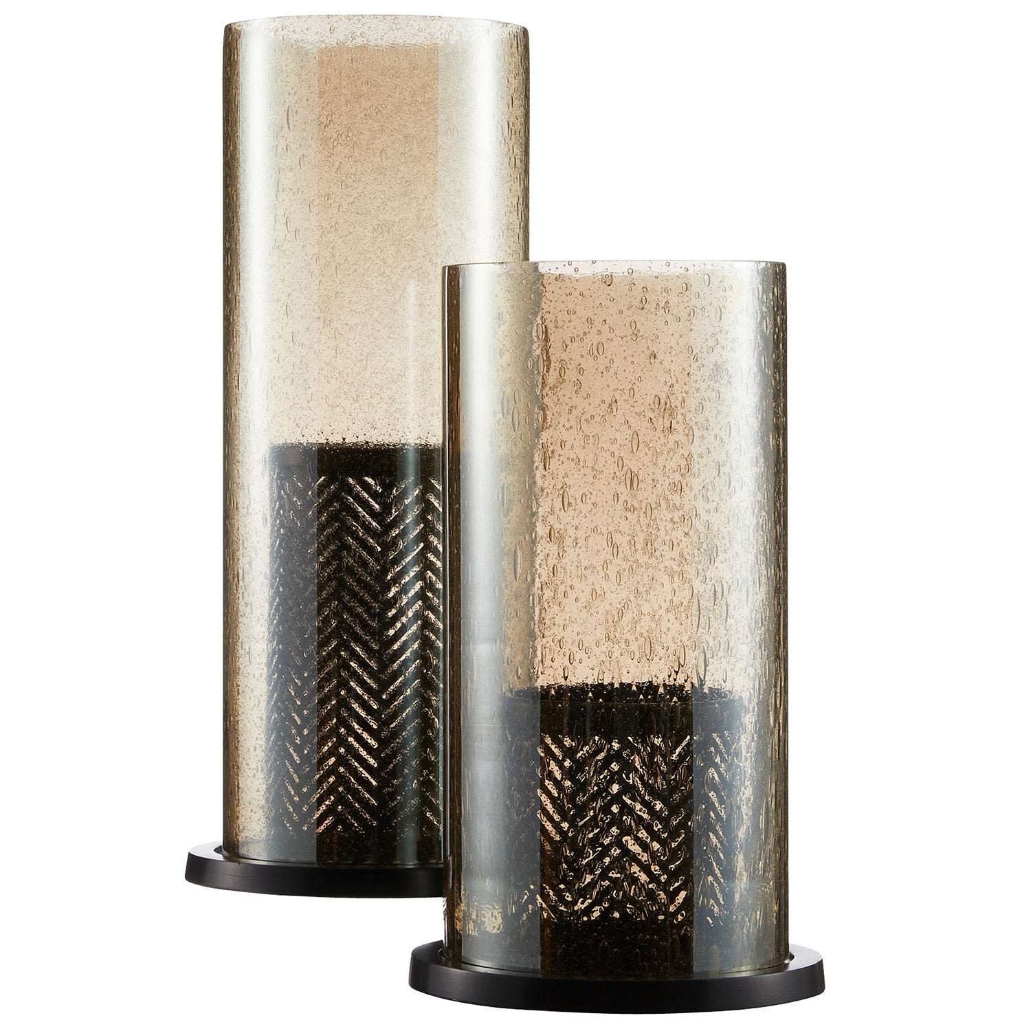 Glass cylinders of seedy smoke glass offer an intriguing play of transparency and light. Mounted on a base of bronze-plated iron, each possesses subtle perforations that lend a playful shadow pattern to the look. Finish will vary.