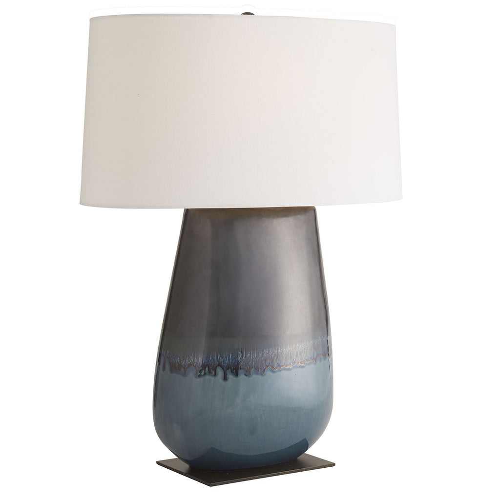 Showcasing a simple ceramic form on a bronze steel plate, the glaze is the real scene-stealer—gunmetal reactive glaze bleeds into teal reactive glaze, so no two are exactly alike. Topped with a white linen drum shade with white cotton lining; finish will vary.