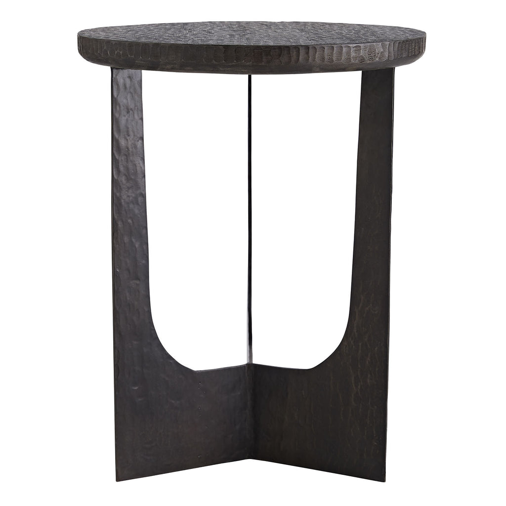 Inspired by the rigid geometric style that is a prominent element in Brutalist architecture, this seemingly simple end table possesses details that make it complex. A mango wood top has been chiseled by hand, showcasing carved details that have been softened by a black wax finish. It is perfectly poised on a hammered natural iron base, which lends a textural element to the intense angles that define its form. It's scaled to fit in a variety of spaces. Finish will vary.