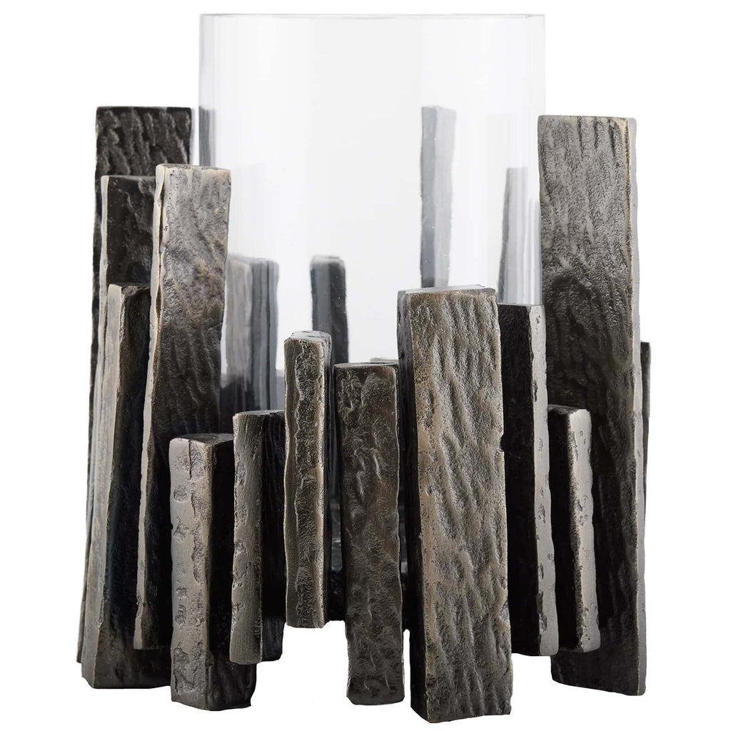 Arteriors Home brings sophistication and style to any interior design project with their collection of decor and tabletop pieces. Inspired by cubist jewelry, the Arteriors Salvator hurricane is as much an art object as it is a striking vessel for candles. Craggy metal slices of antiqued cast aluminum form an undulating cuff around a clear glass column, composing an accessory that commands any surface. Finish will vary.