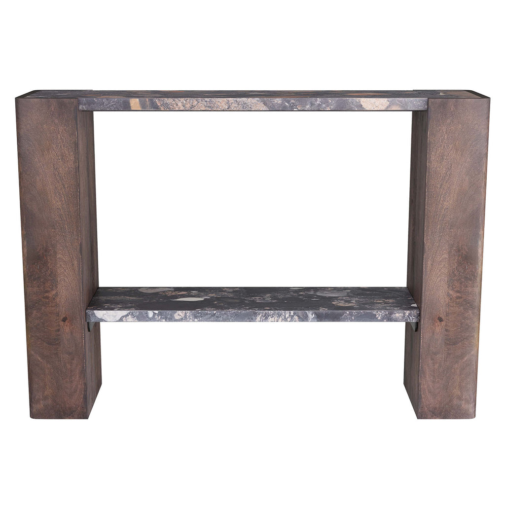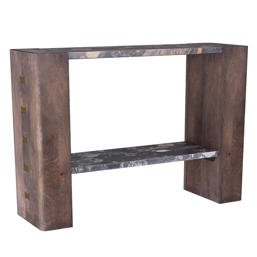 A rich composition of natural materials, the Arteriors Torelli console makes a handsome addition to any interior. Monumental umber-finished mango wood legs create a foundation for neutral caspian marble surfaces. The tactile, leathered marble features sizable, terrazzo-style particulate. Antique-brass iron bowtie-shaped inlays ornament the sides of each leg. Finish will vary.