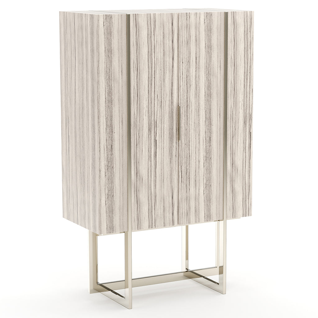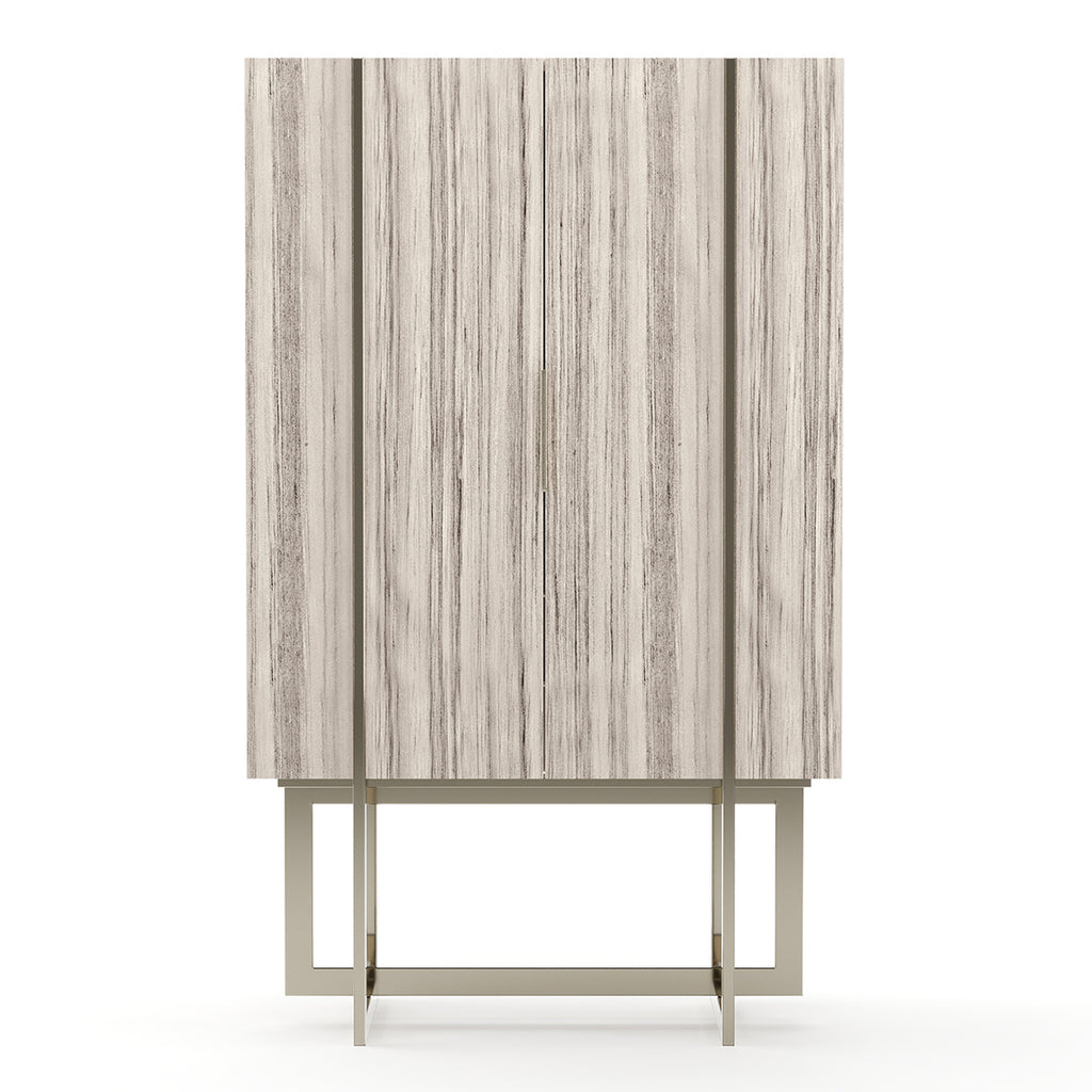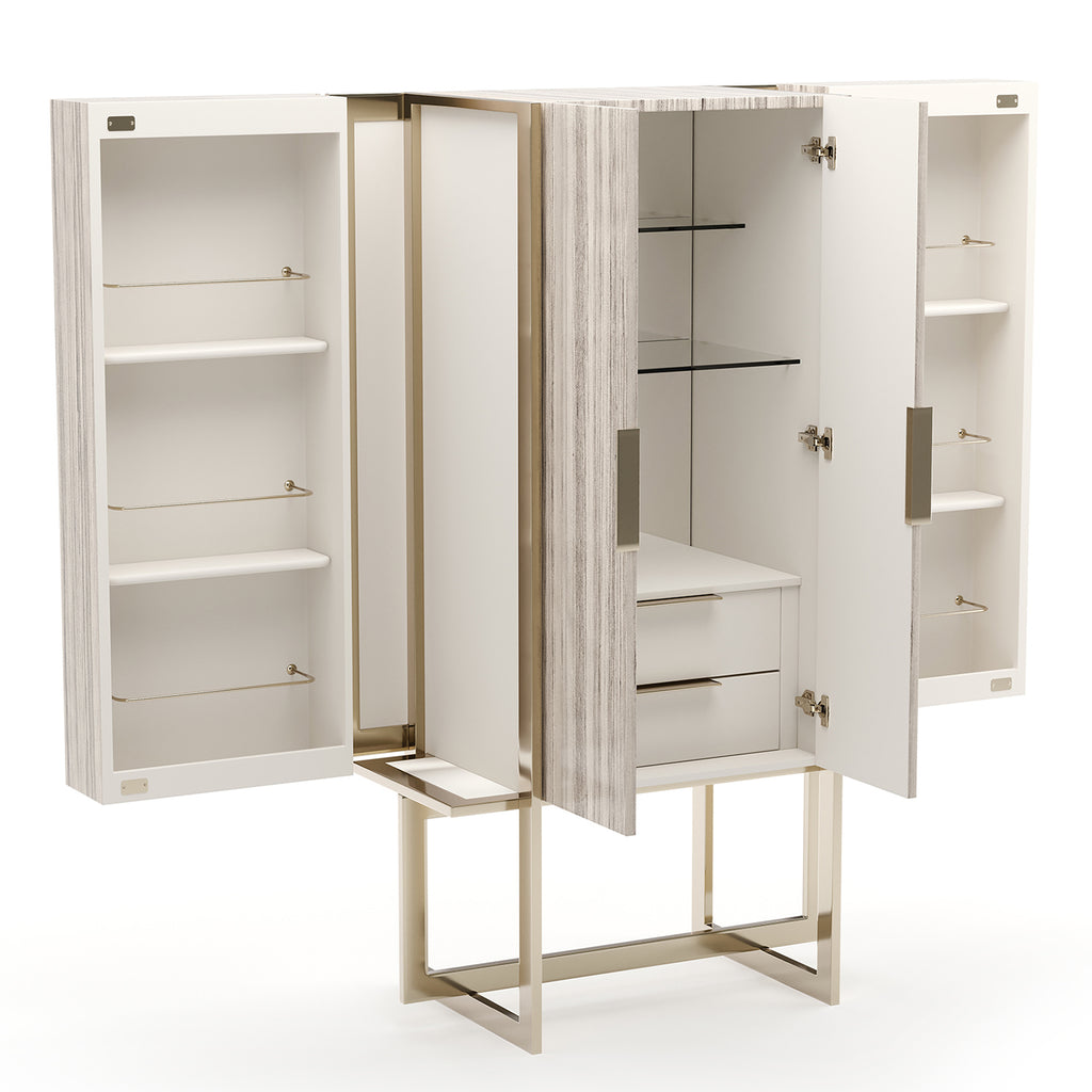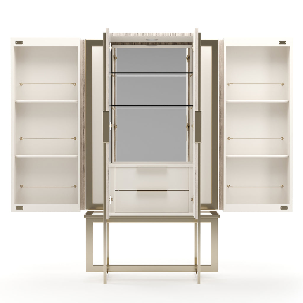 The Wish You Were Here Bar Cabinet Light blends sophisticated functionality with luxurious design. Crafted in Sandstone and framed by Whisper of Gold metal, it features swing-out doors with elegant metal hardware, a mirrored back, integrated wine bottle storage, adjustable glass shelves, and Almond Milk finished drawers, creating a refined home bar experience.