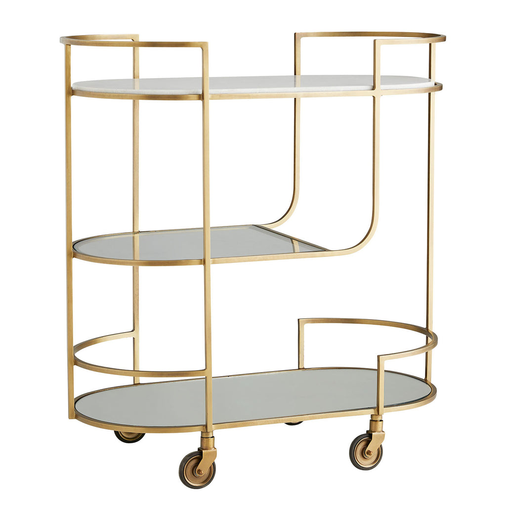 A luxe capsule-shaped bar cart with an antique brass iron frame featuring three tiers—inset with white marble, clear glass, and mirrored glass panels. Finish will vary; periodic stone sealing recommended.
