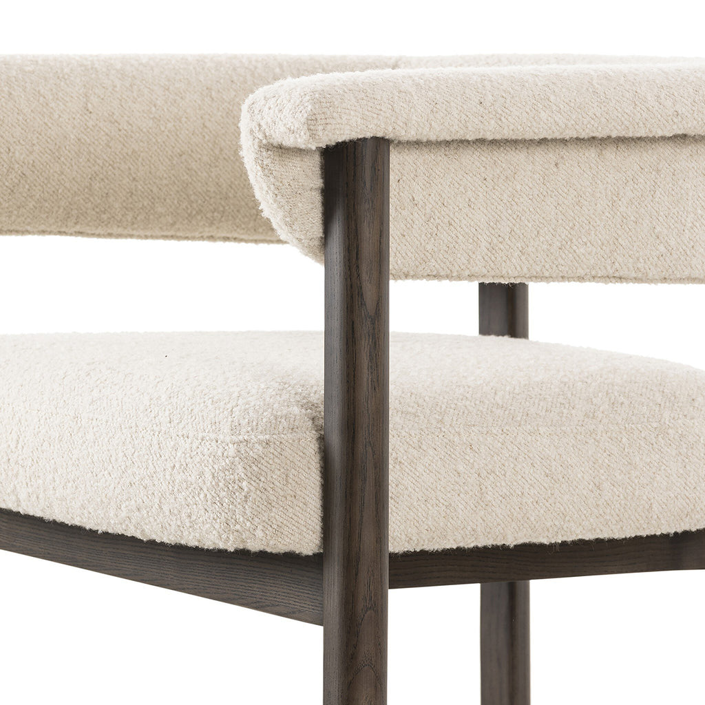 Upholstered in high-performance fabric, this sculpted bar stool features a comfortable yoke back and exterior fold detailing, all framed by solid ash. Performance fabrics are specially created to withstand spills, stains, high traffic and wear, ensuring long-term comfort and unmatched durability.