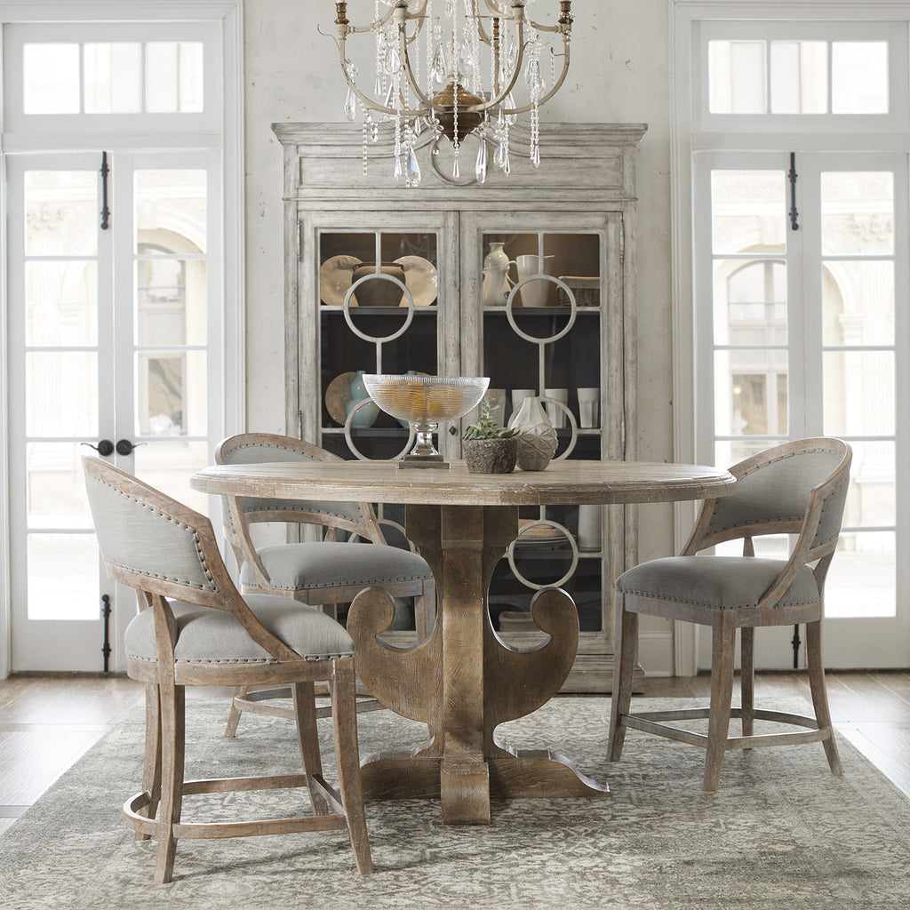 Linger over conversations and relaxing meals -- in comfort and style with the Boheme barrel-back, 39-inch-high counter stools. Design details are delightful, with a nail-lined gimp welt lining the outside of the seat and back, with each stool covered in a soft gray Antwerp Linen fabric. The textural Antique Milk White finish is a nearly opaque brush-painted look over a soft brown surface.