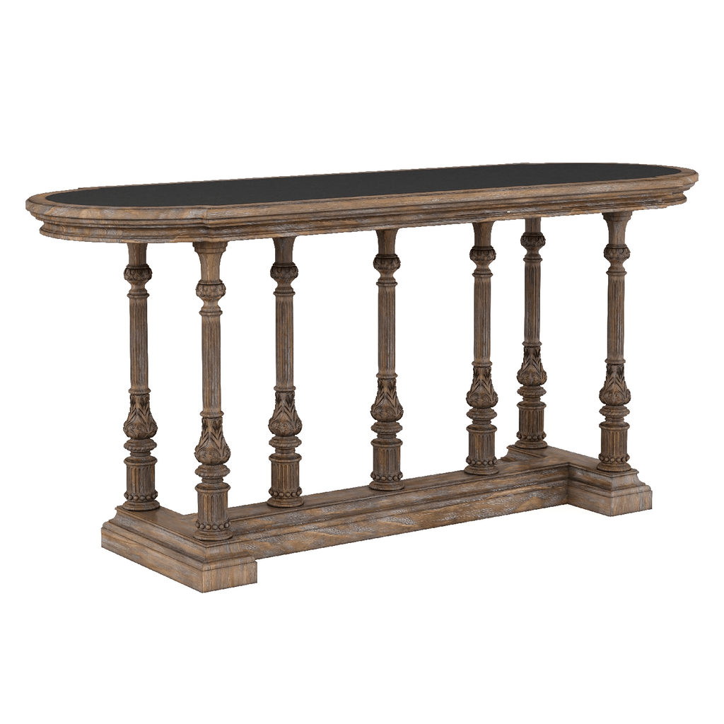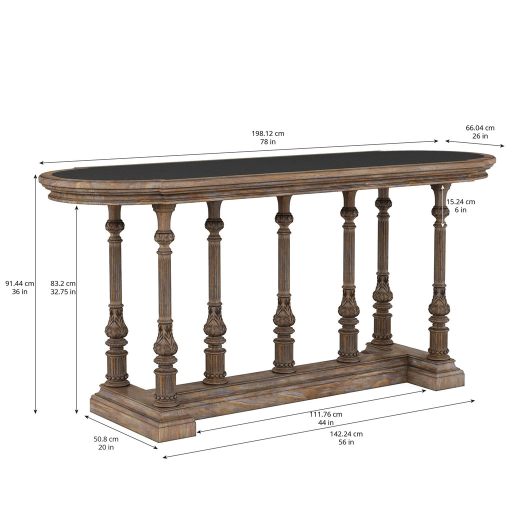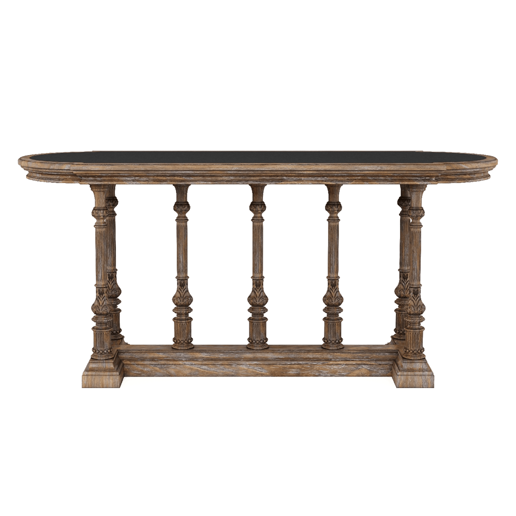 Step across the threshold of a new design frontier with the Architrave collection. Based on an architectural term that refers to a frame surrounding a doorway, this collection symbolizes a transition from history to the future. Architrave is historically inspired, reinventing the strong lines and classic symmetry of Neoclassical style from the Louis XVI period in France. Gather around this pub table from the Architrave collection and experience Old World charm in a contemporary dining setting. The oval top is finished in sophisticated honed black stone. A stunning set of French neoclassical columns dazzles from below, featuring traditional acanthus and beading details. The simple beauty of pine with a rustic, hand-glazed finish updates this intricately crafted table for the modern aesthetic.