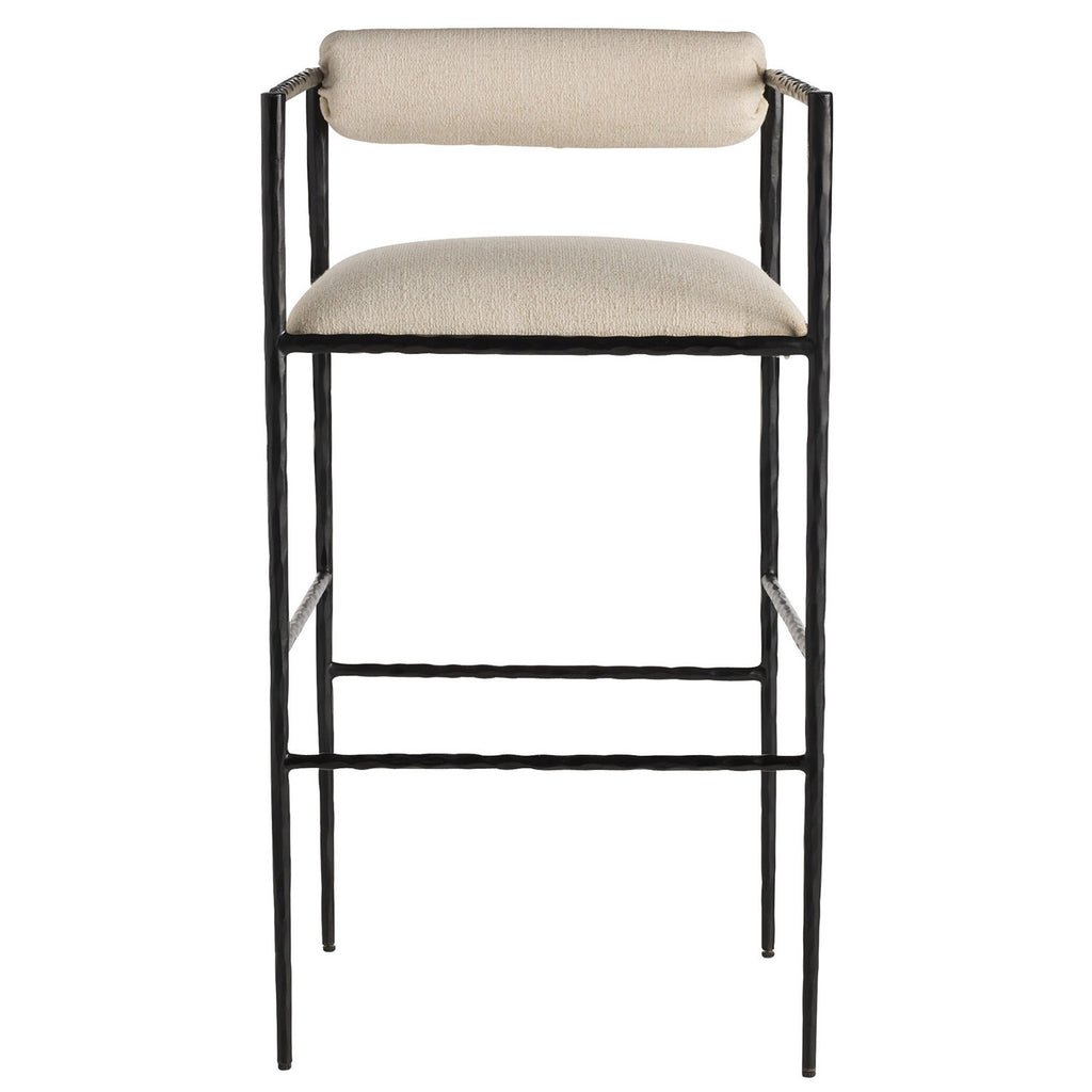 This exquisite bar stool is perfectly poised, perched on delicate hand-forged natural iron legs and upholstered in Oxford White performance fabric with tight seat and bolster back. Finish will vary.