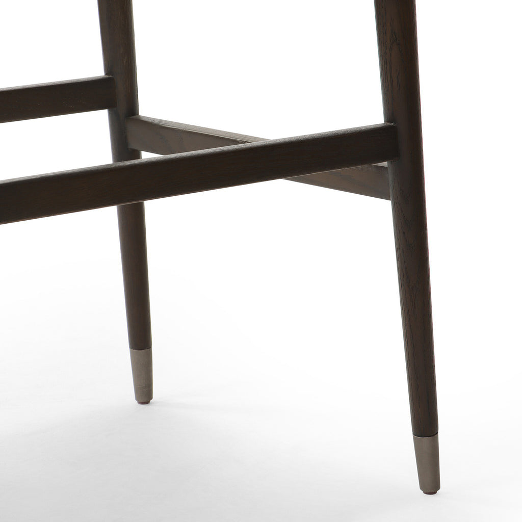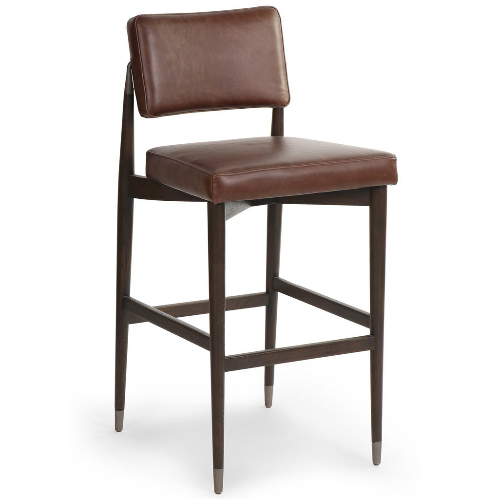 Eighties inspiration gone modern. With iron-dipped caps, tapered legs of solid oak frame this bar stool's seat and back, upholstered in brown top-grain leather. Slim wood stretchers add an airy vibe.