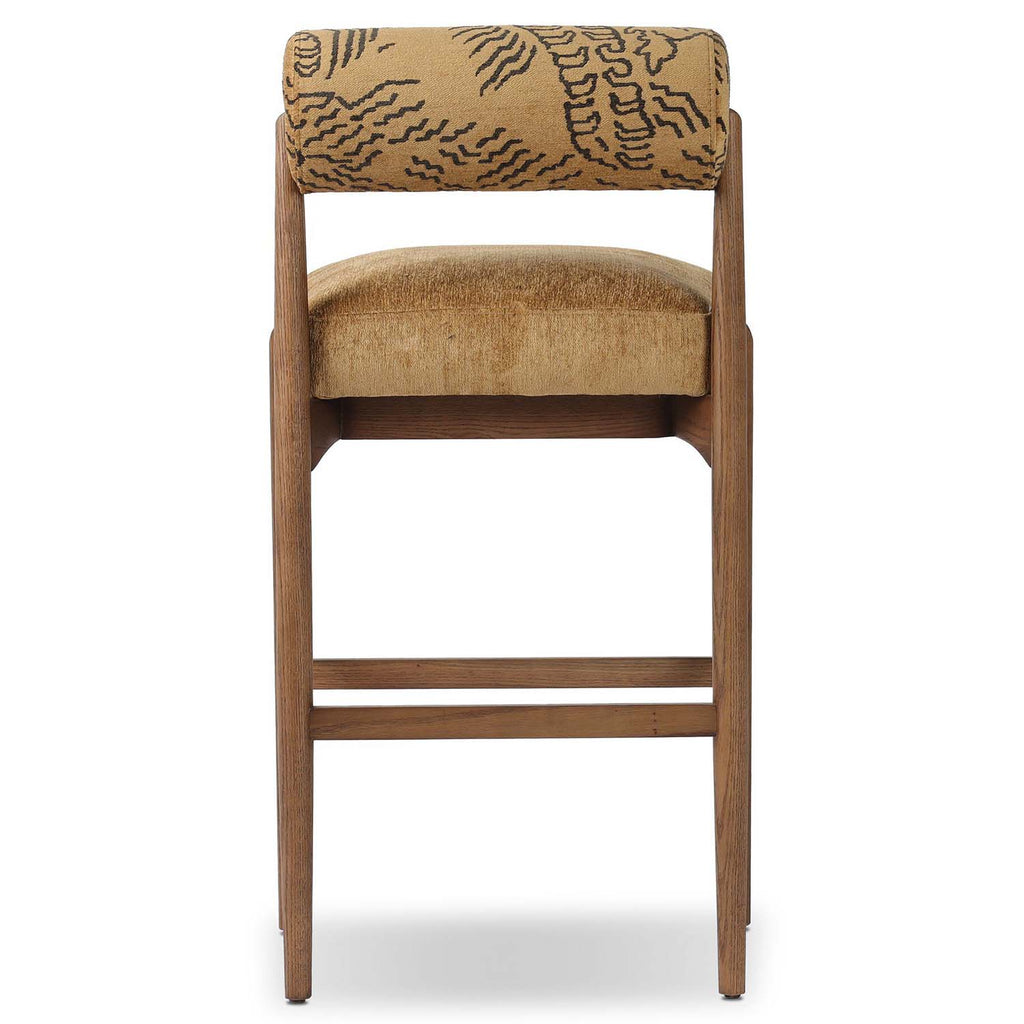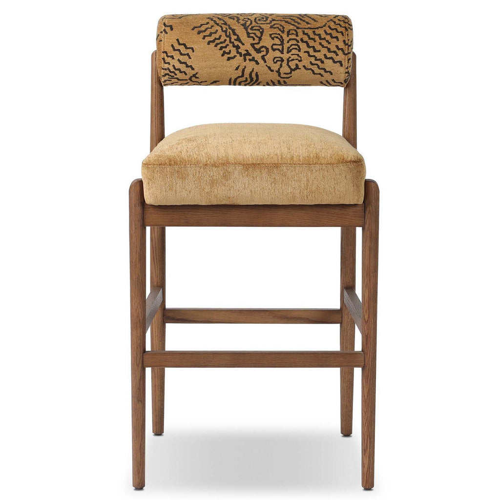 The classic bar stool gets a playful update with a bolstered cylinder seat back. Boldly printed upholstery and warm-finished oak elevate your bar, kitchen or dining space.