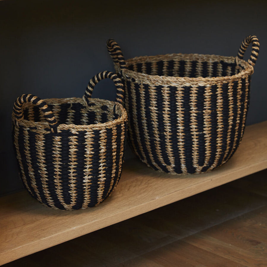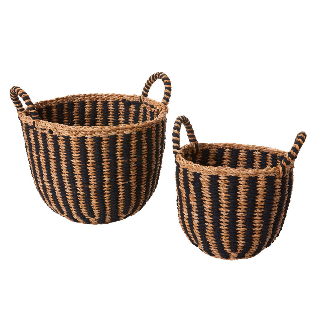 The artistry is in the trendy striped pattern & hand-woven, natural sea grass & jute details of this set of 2 Sangu Baskets. These nesting baskets feature 2-toned handles & a black & neutral vertical stripes. Though no liners are included, drop-in plants fit nicely if a saucer or other liner is placed in the bottom. These are also lovely decorative containers in a living room or playroom filled with toys, blankets, & more.