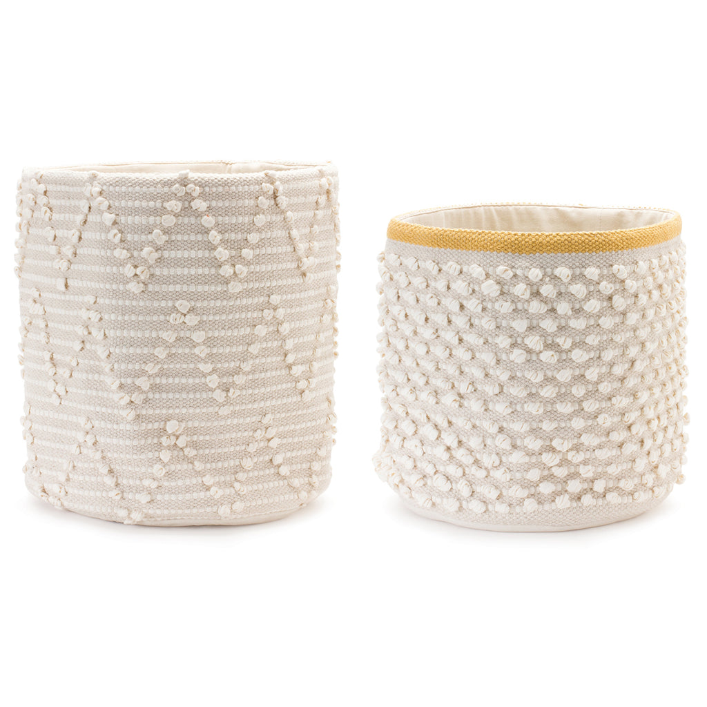 Add a cozy touch to your living space with this beautiful set of Woven Cotton Baskets. Featuring two assorted sizes, this set is a great fit for your mid-century or boho style of decor. The warm white and yellow tones paired with the geometric woven design is the perfect combination to create a stunning display. The quality cotton material is sure to last for seasons to come. Complete the look by adding a stack of vintage magazines, a throw blanket, or a faux potted plant to each basket. It can be used as storage basket, laundry basket, toy basket, and more!