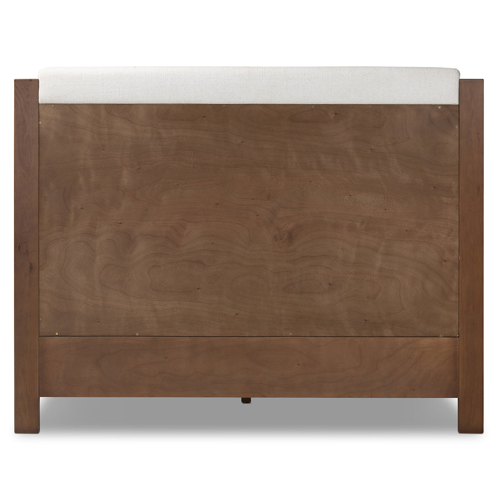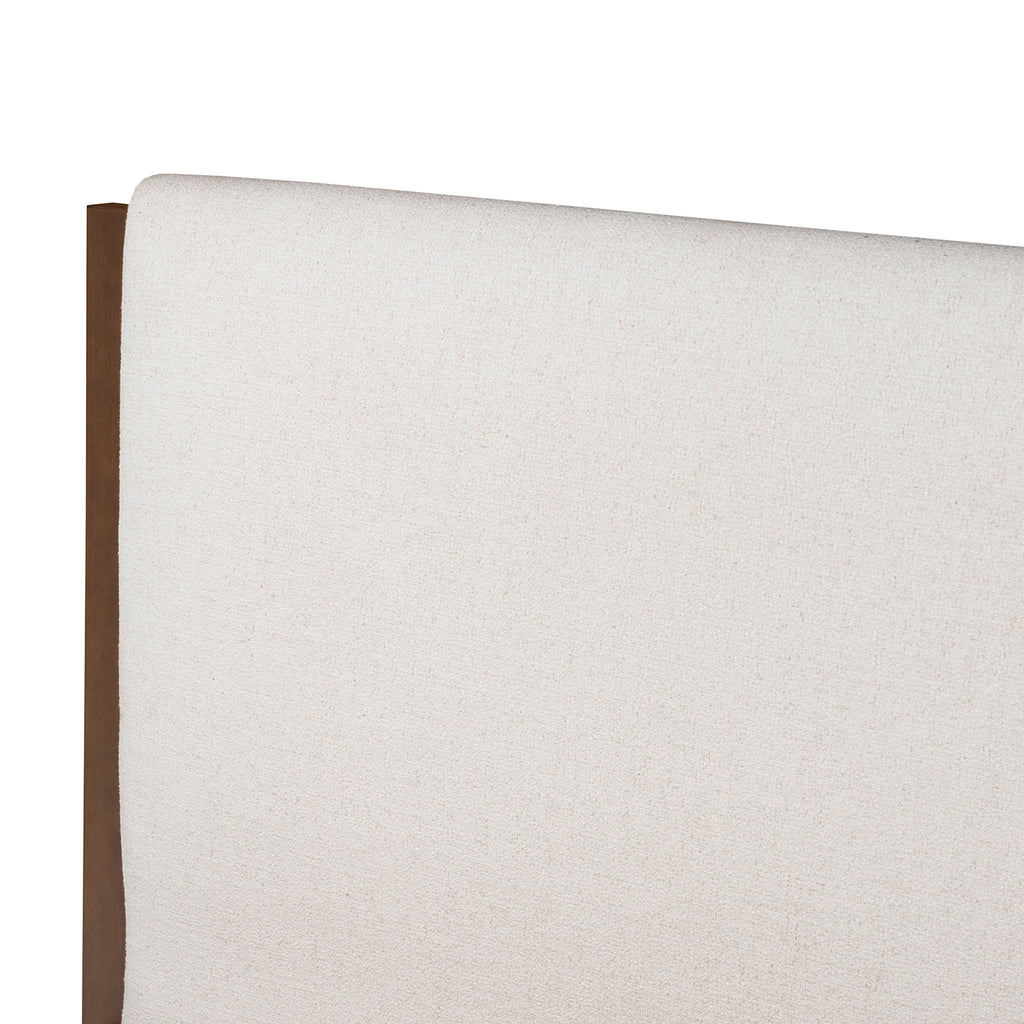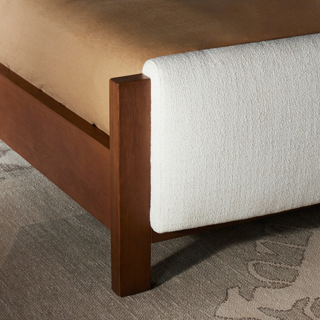 A midcentury-inspired frame is updated with modern lines and plush upholstery on both ends. Headboard and footboard cushioning wrap around a wooden frame made from a mix of solid oak and oak veneer with beautiful graining throughout.