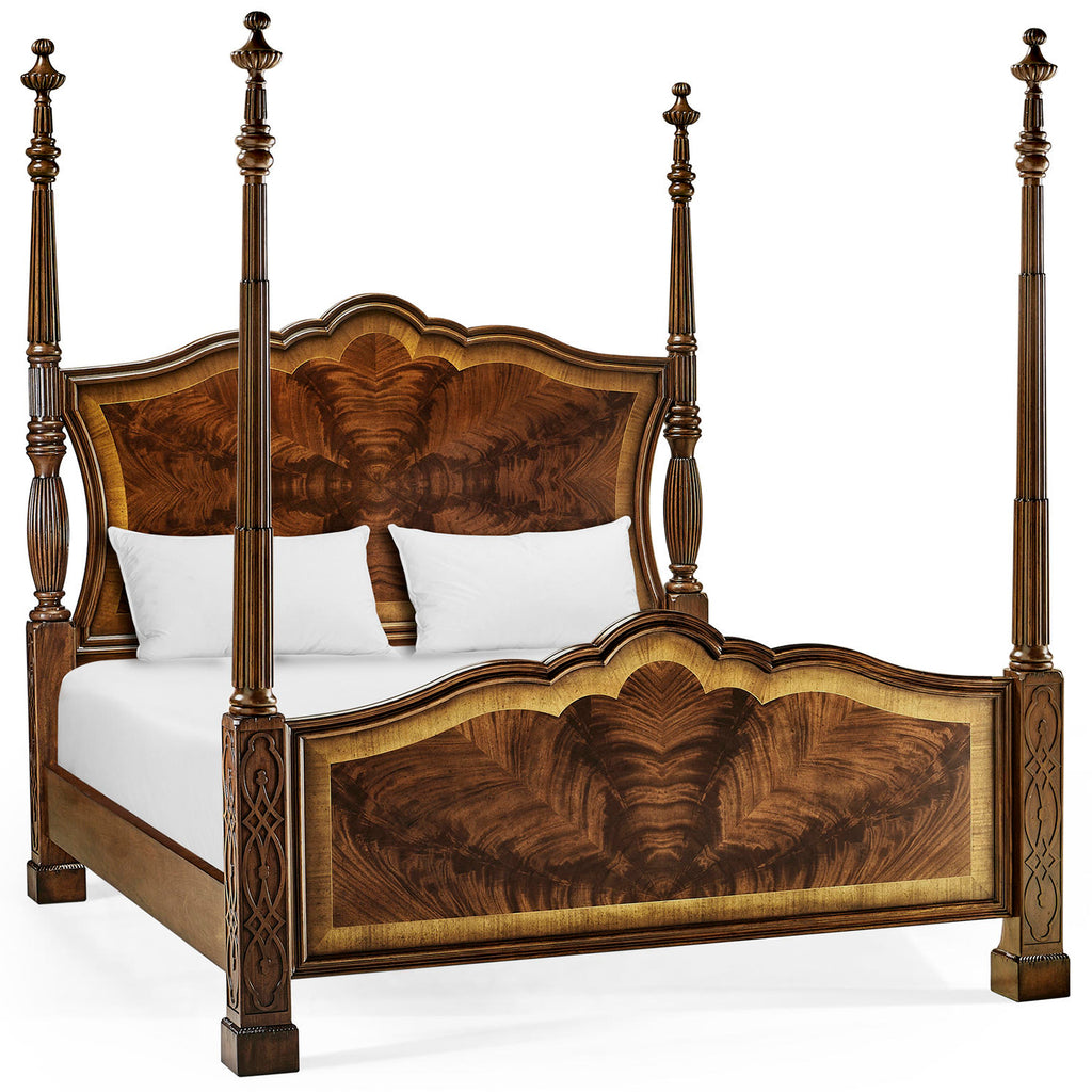 Chippendale style four poster bed with the finest mahogany flame veneers and satinwood crossbanding on the head and footboard, high turned and fluted posts on square carved fretwork legs.