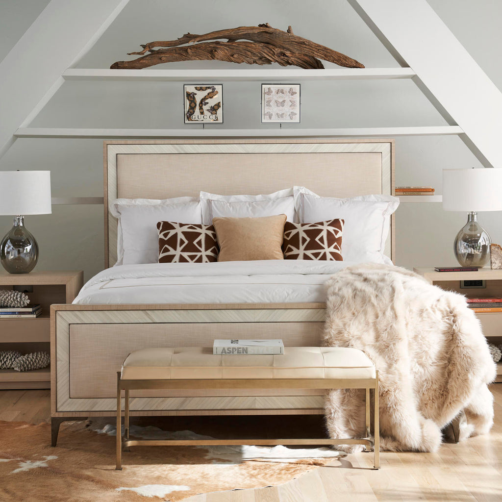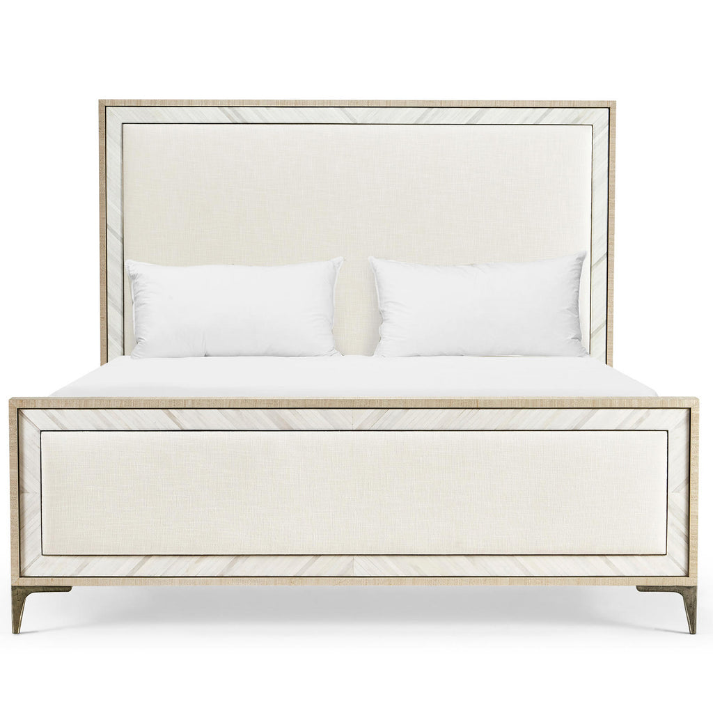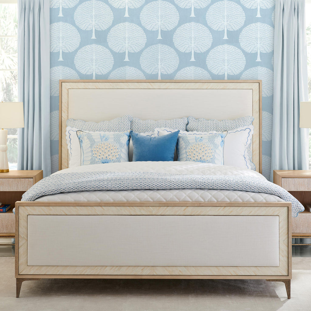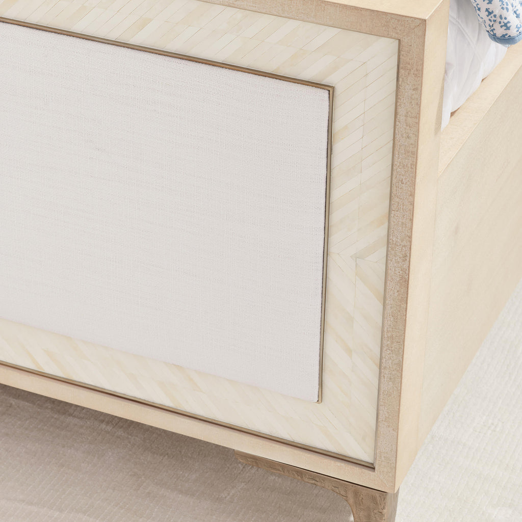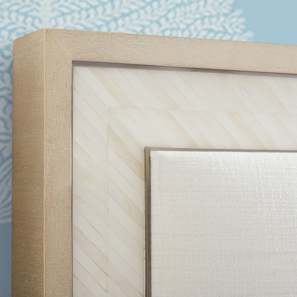 A showstopper of Jonathan Charles’ new Water portfolio, the Tideline Bone & Linen Upholstered Bed is beautifully made from sustainably harvested materials with flawless craftsmanship. Performance Linen upholstery compliments flush Bone Inlay framed with stainless steel banding finished in Satin White Brass for undeniable elegance and understated glam. Delicately perched on custom cast stainless steel feet, Tideline elevates modern and contemporary bedroom spaces.