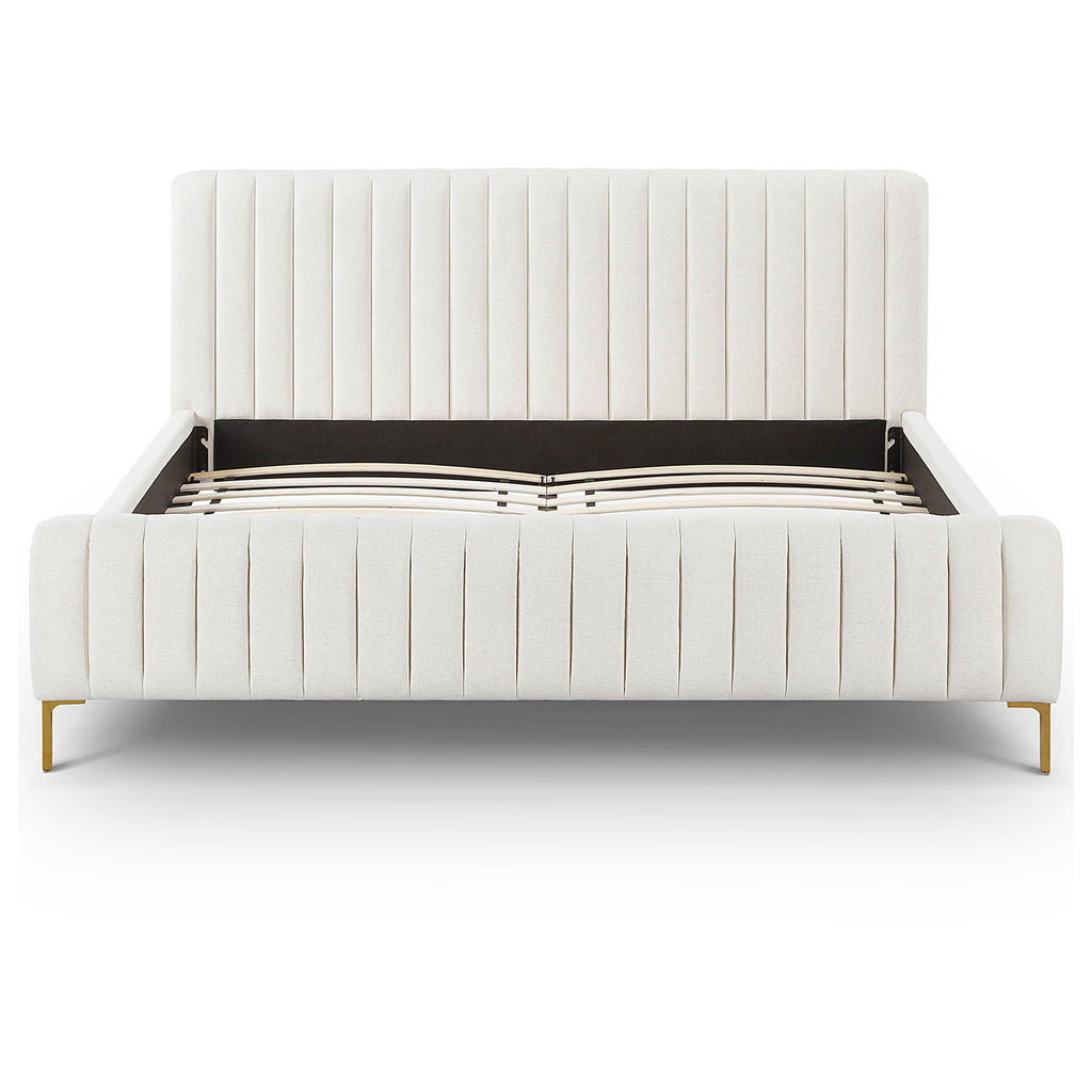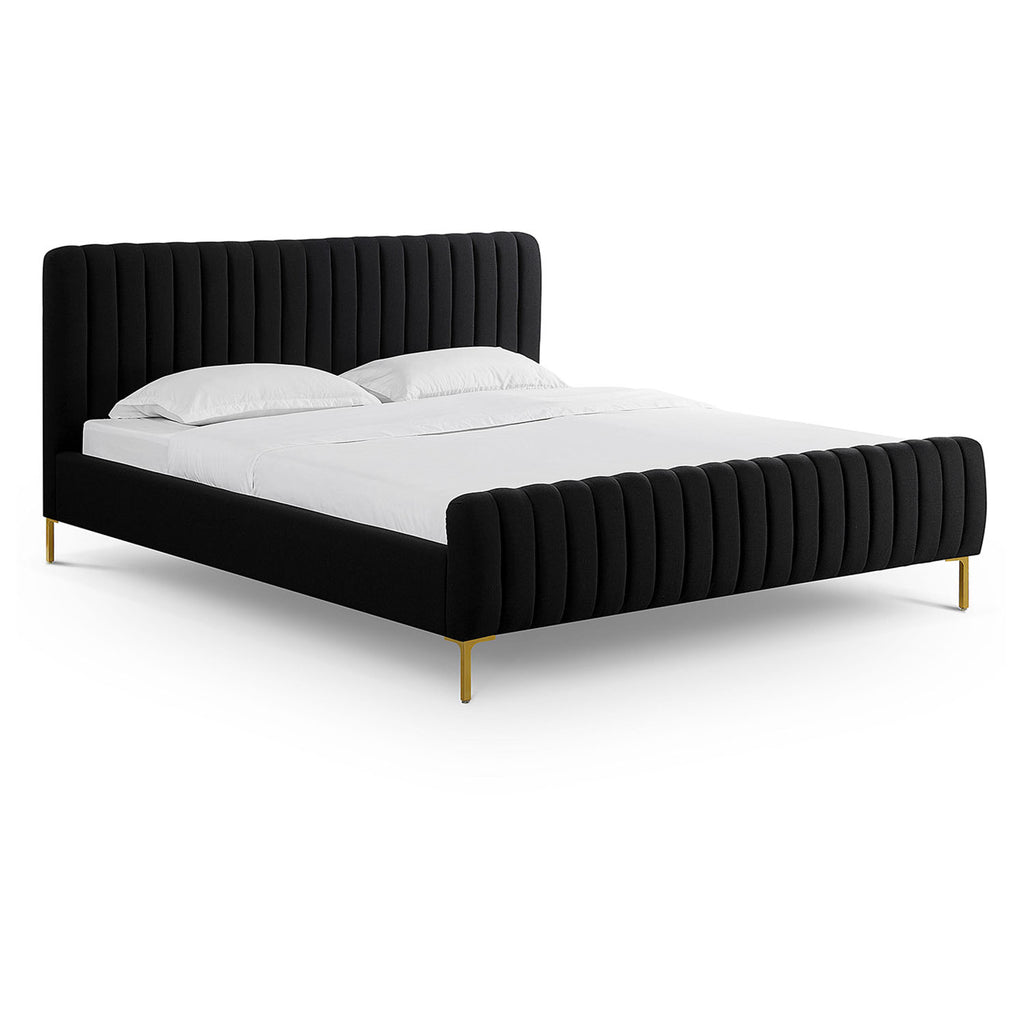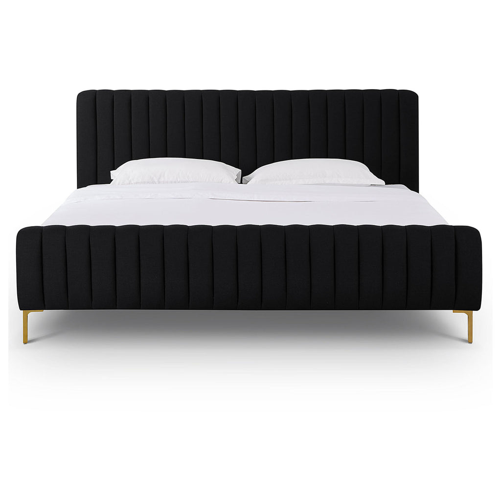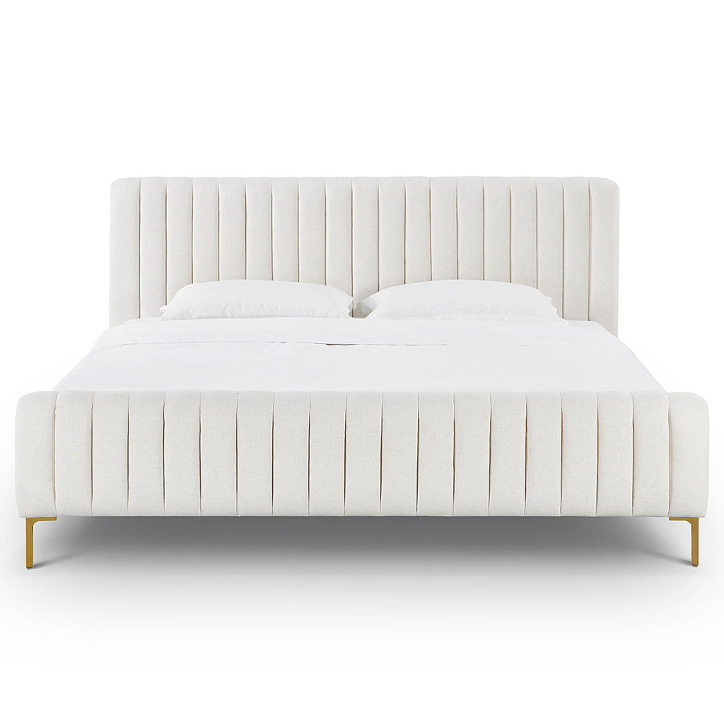 We can't guarantee your dreams will come true, but at least we can help you dream in style. The Angela bed features glam design, channel tufting and gold legs that pop against the sumptuous upholstery. Available in queen or king and multiple color and fabric options.