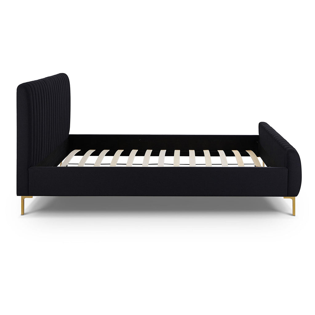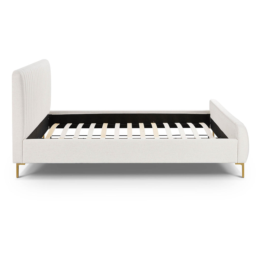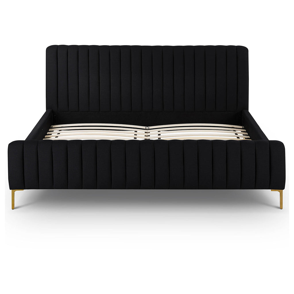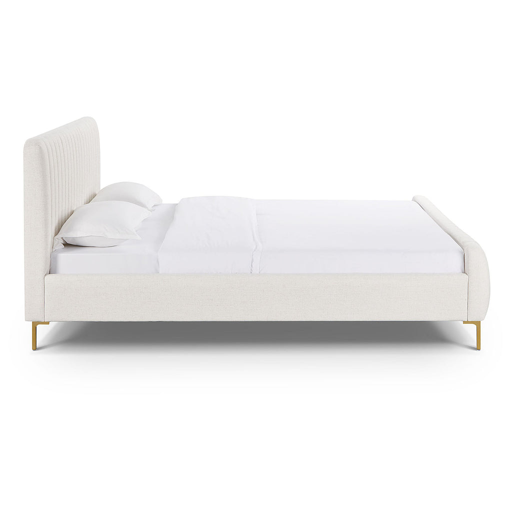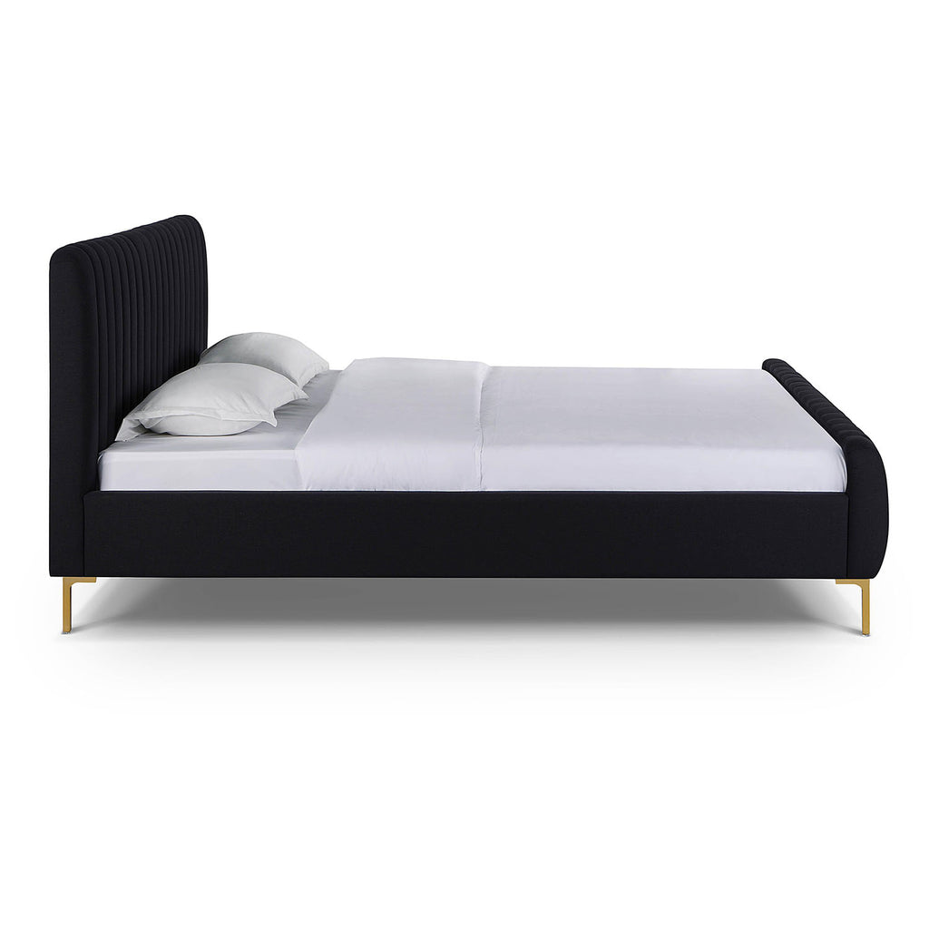 We can't guarantee your dreams will come true, but at least we can help you dream in style. The Angela bed features glam design, channel tufting and gold legs that pop against the sumptuous upholstery. Available in queen or king and multiple color and fabric options.