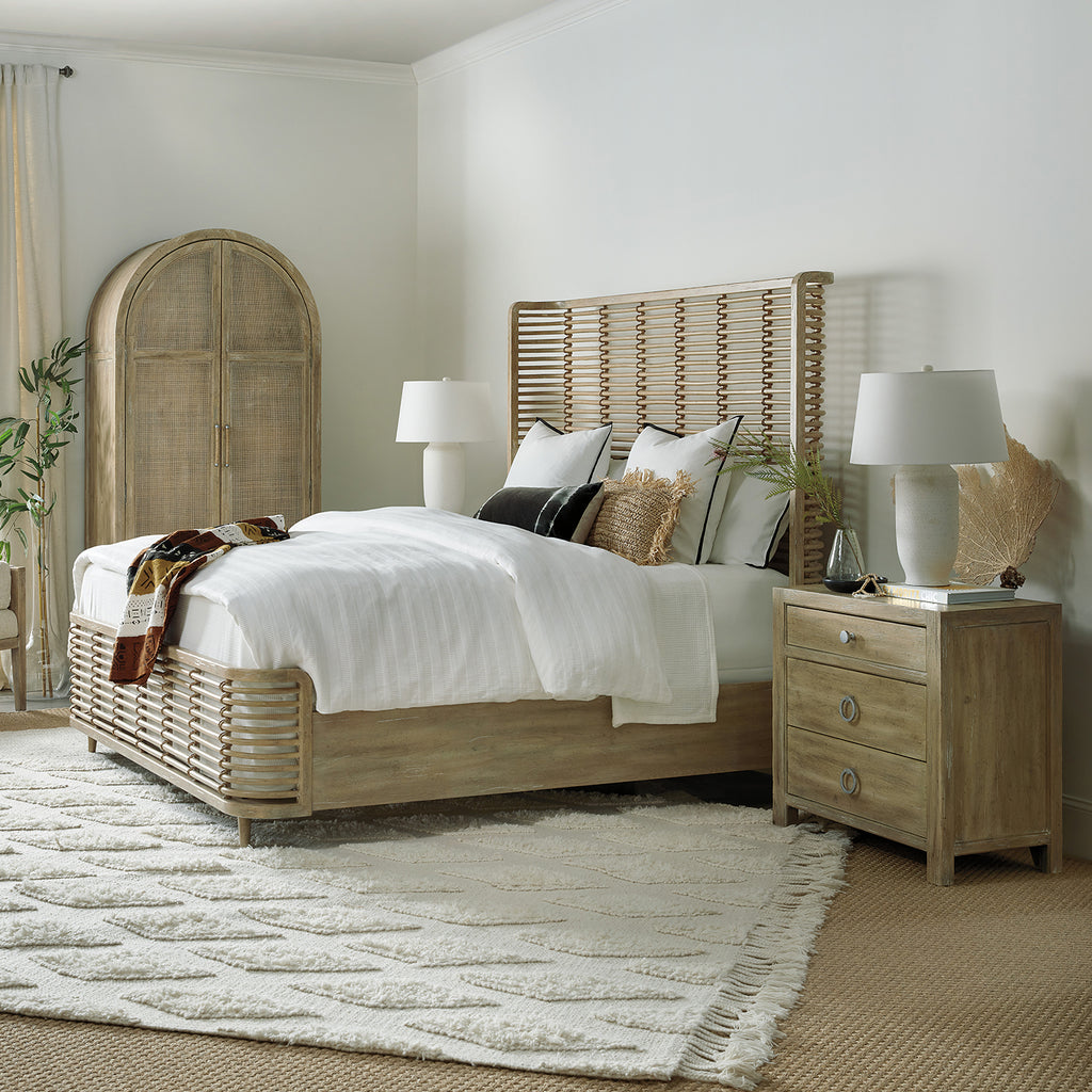 Crafted of Pecan Veneers, Cane, Raffia and hand-tied Jute Rope, the Surfrider Queen Rattan Bed epitomizes a relaxed California casual lifestyle. The signature bed is finished a light natural finish called Driftwood with distressing including sandblasting and bleaching.