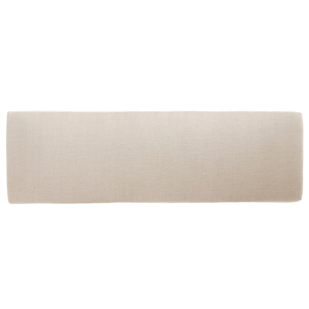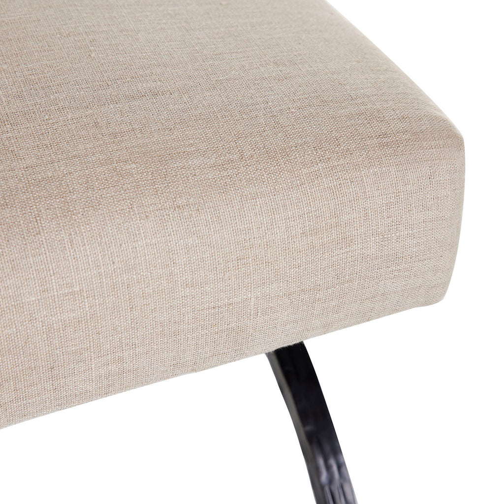 A long, rectangular seat rests on a perfectly poised hand-forged iron frame with curved legs, offering artisanal detail and understated elegance. The seat cushion is covered in natural linen. Finish will vary.
