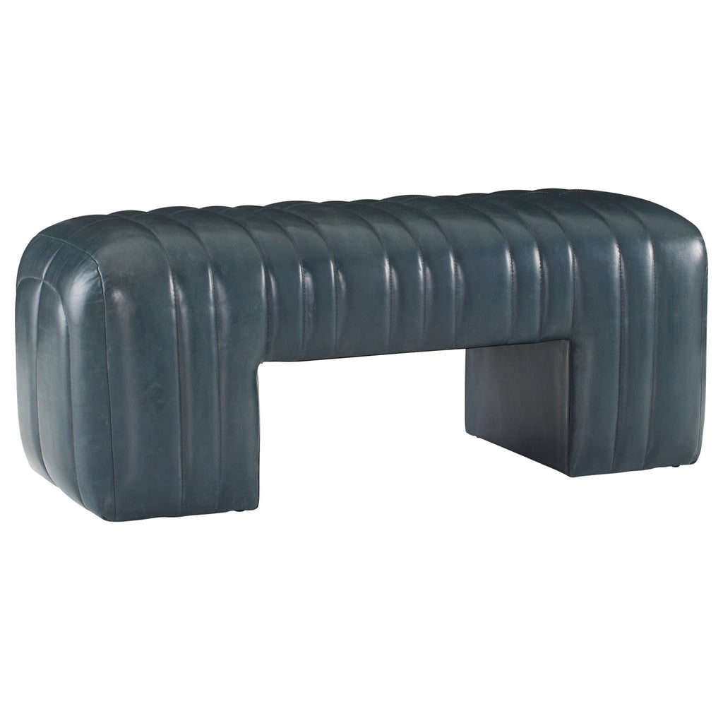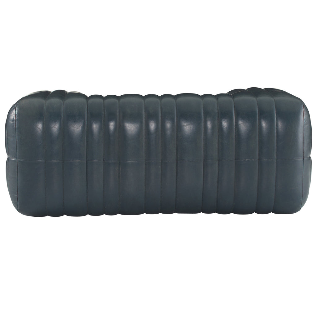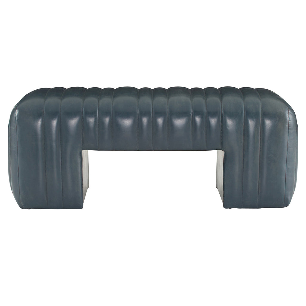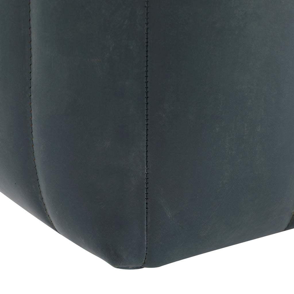 Built with generous proportions and varied channeling, a gymnastics pommel horse influenced the rounded form of our distressed storm leather bench. Its wide sides and graphic opening give it visual appeal from every angle, while the robust scale offers a grounded presence in any seating area. Leather will vary.