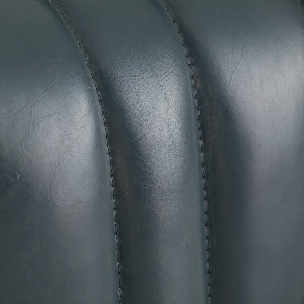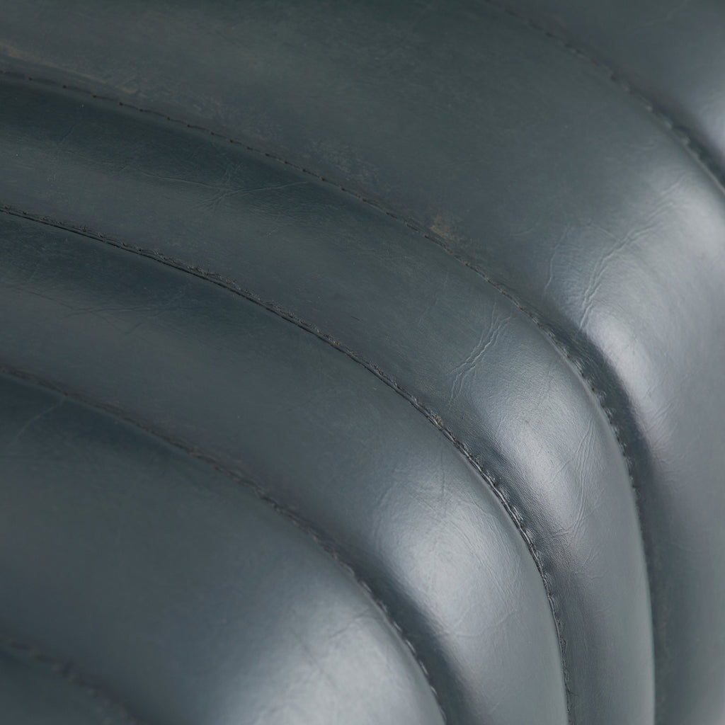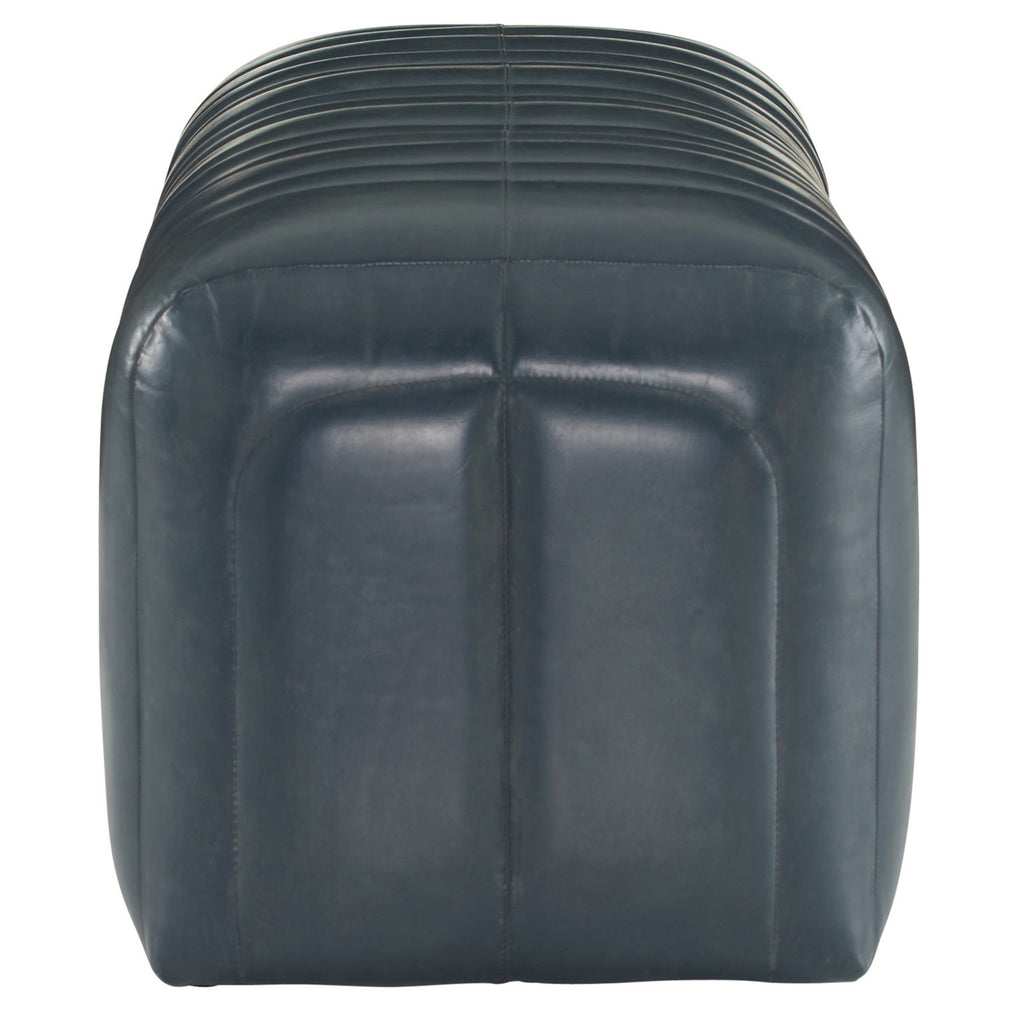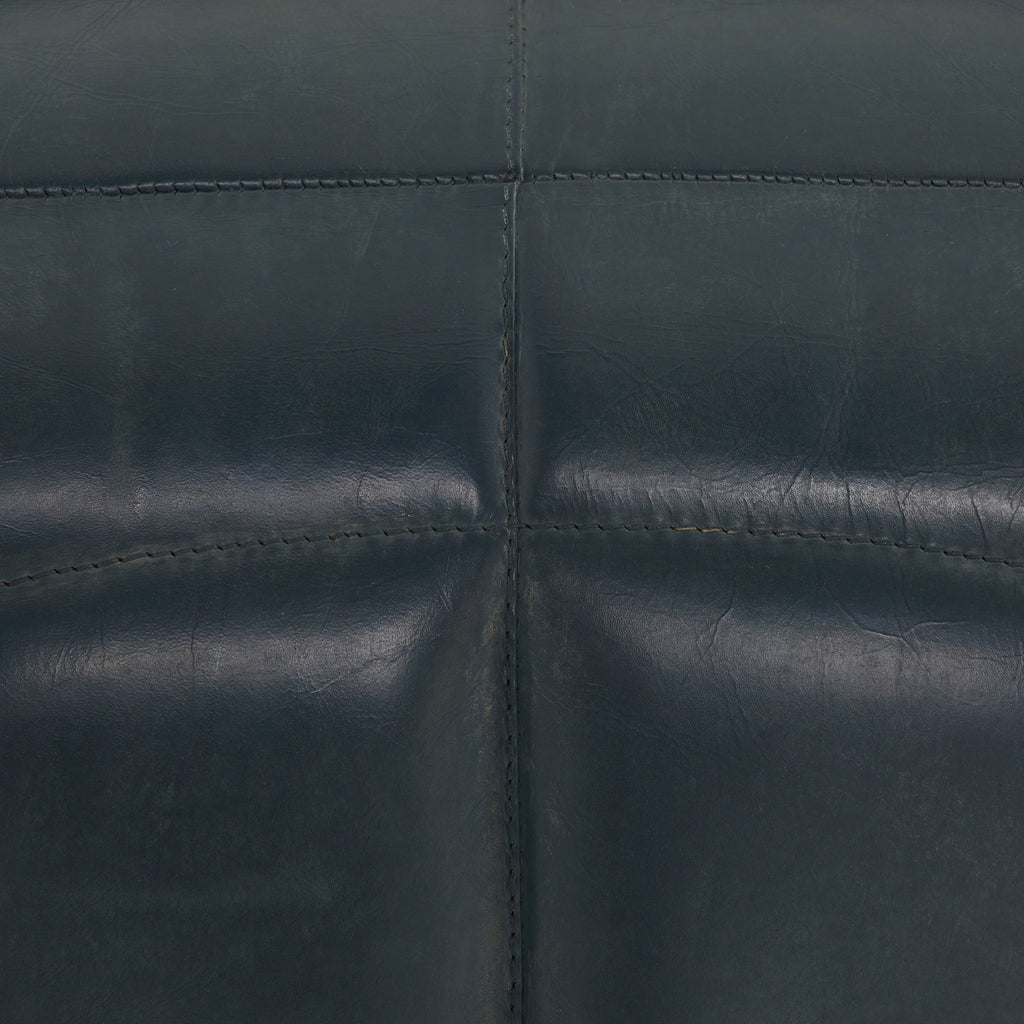 Built with generous proportions and varied channeling, a gymnastics pommel horse influenced the rounded form of our distressed storm leather bench. Its wide sides and graphic opening give it visual appeal from every angle, while the robust scale offers a grounded presence in any seating area. Leather will vary.