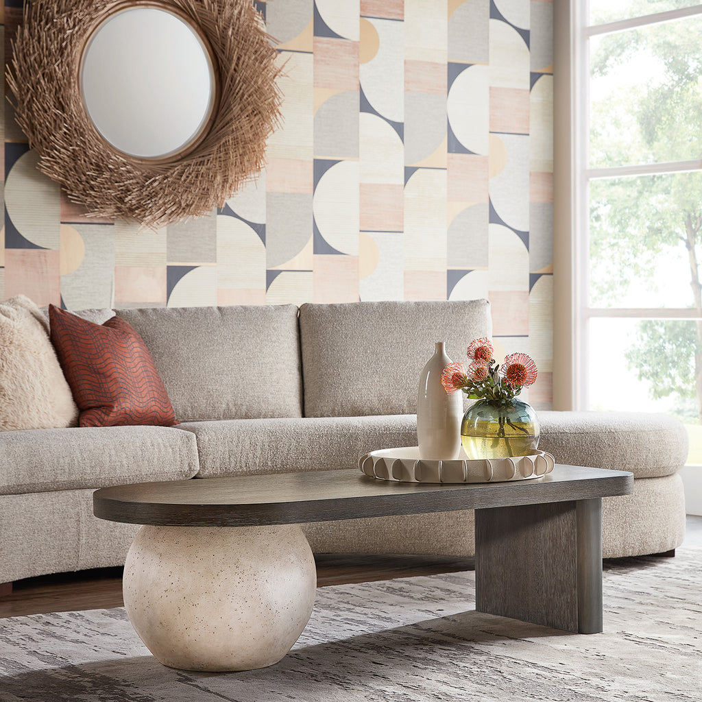 With the aesthetic of an artistic sculpture, the Gibbons Cocktail Bench pairs a pedestal leg with a round ball base in a neutral color palette. Crafted of Oak Solids and Oak Veneers with resin, it has a dark Oak finish with a cream-colored contrasting ball base.