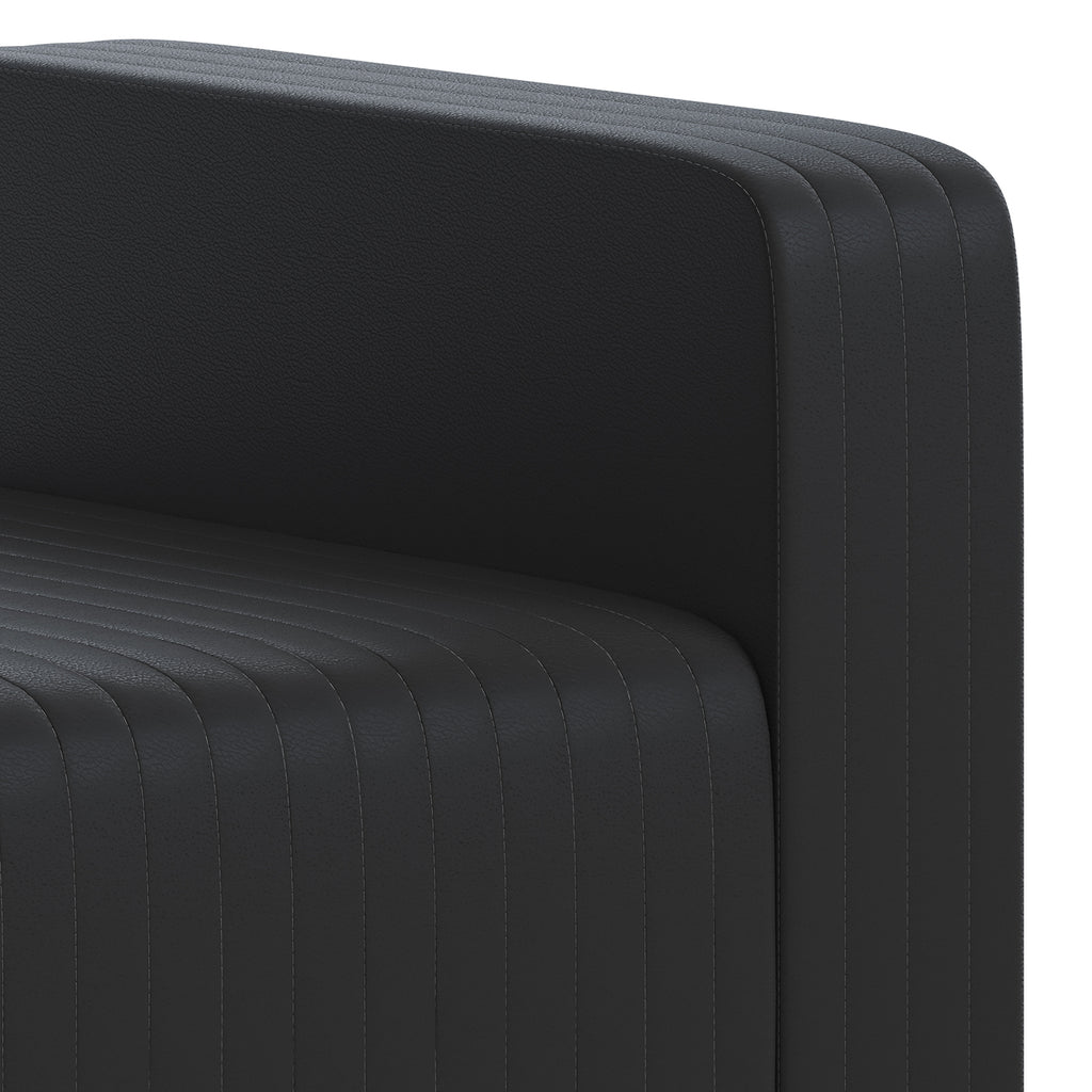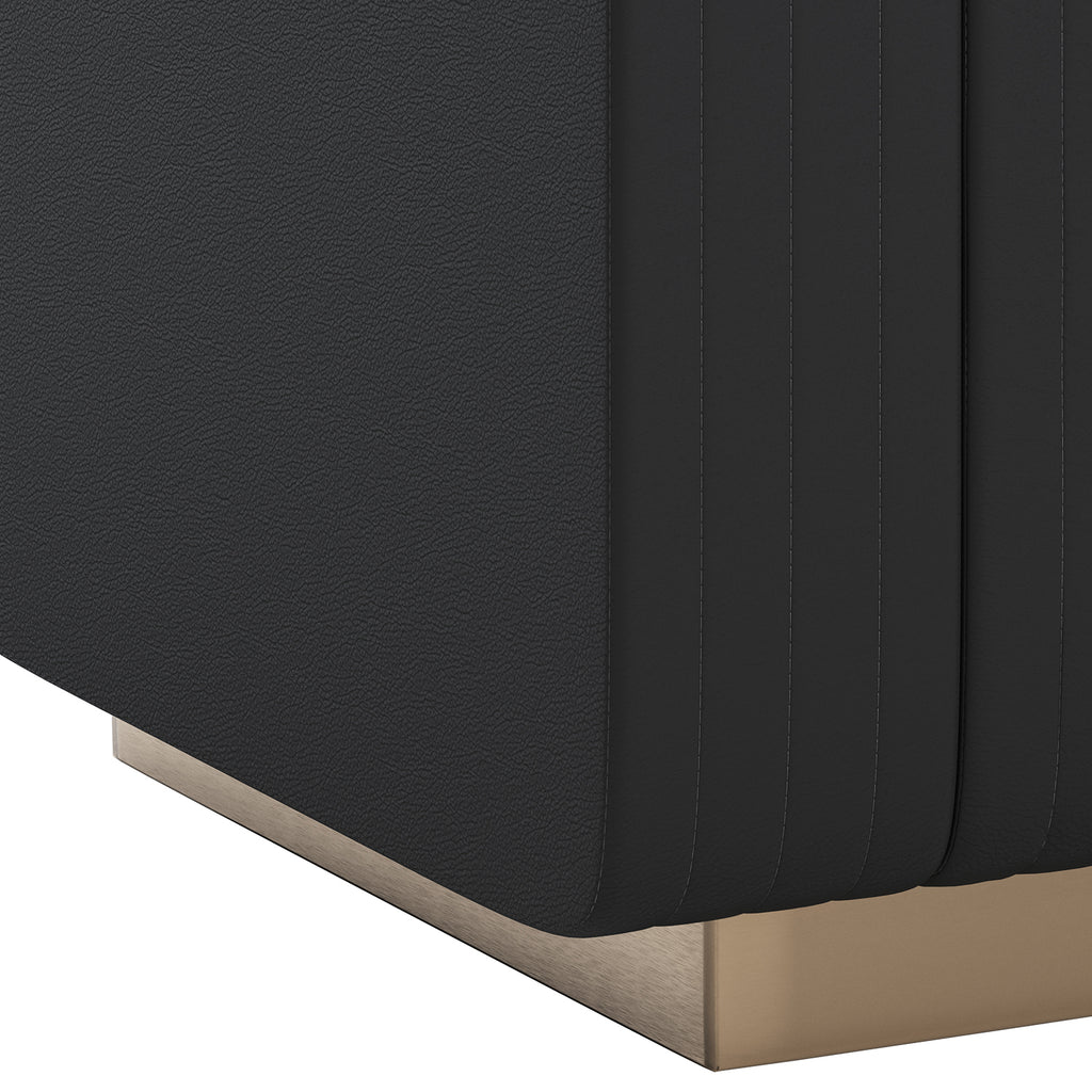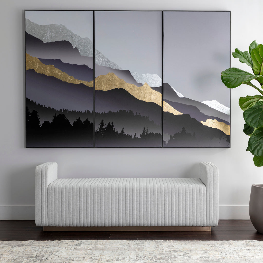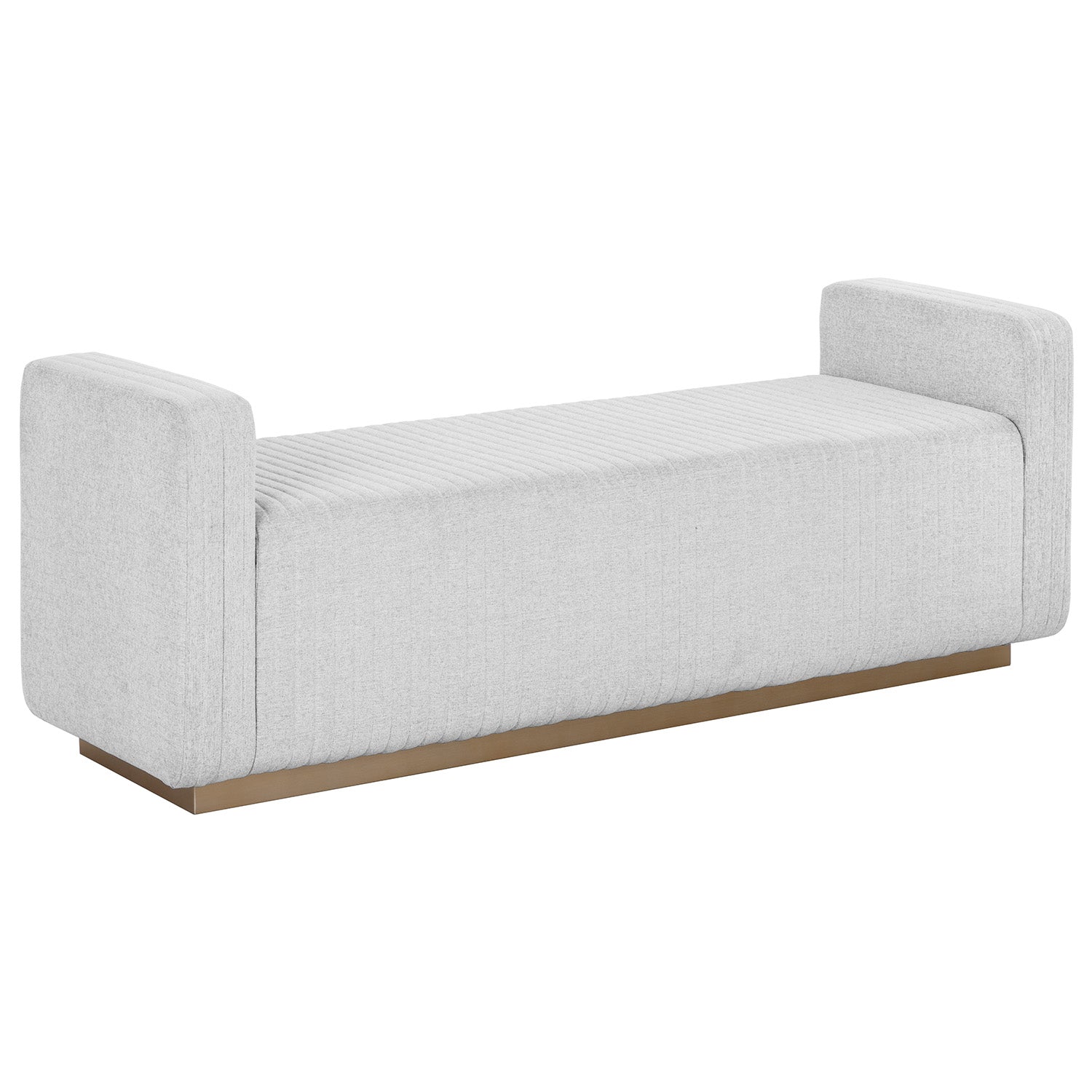 Boasting a chic block design, this modern bench features a minimalist design with high impact. Upholstered in ernst silverstone fabric with channel tufting. Completed with a striking antique brass stainless steel base. Also available in maven black faux leather.