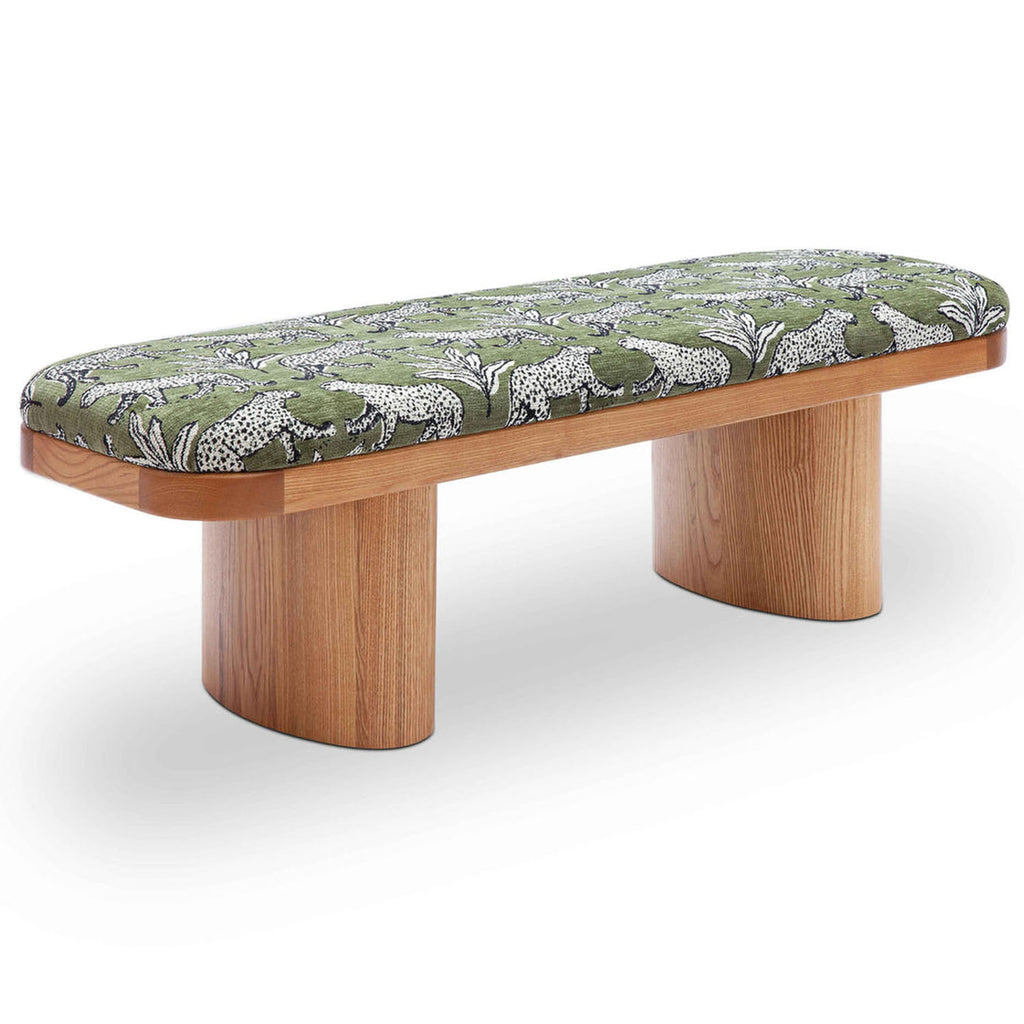 The Ollie Bench is an inspired piece with Danish-leaning design. The perfect warm mid-tone wood is sculptural and substantial topped with luxurious olive green leopard jacquard print fabric. Place Ollie anywhere in your home to complete a space with thoughtful intentionality.