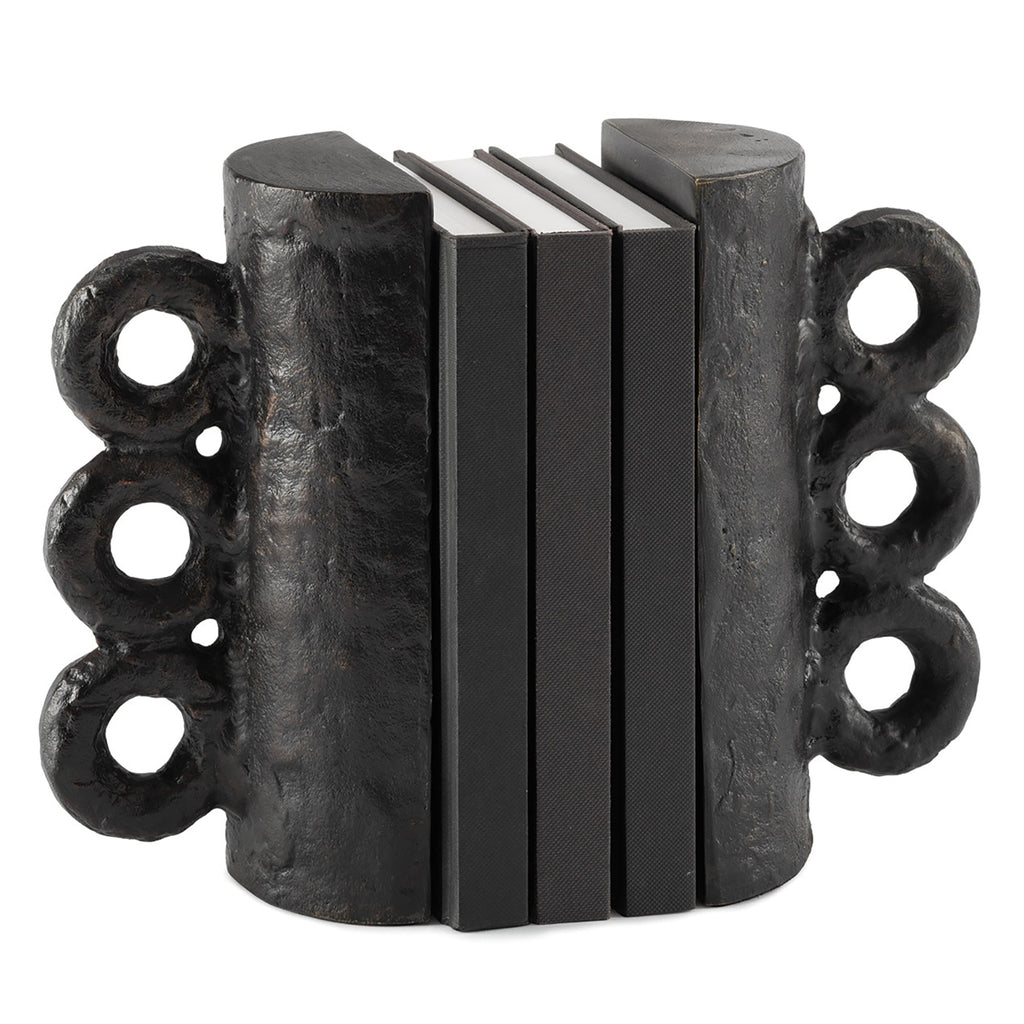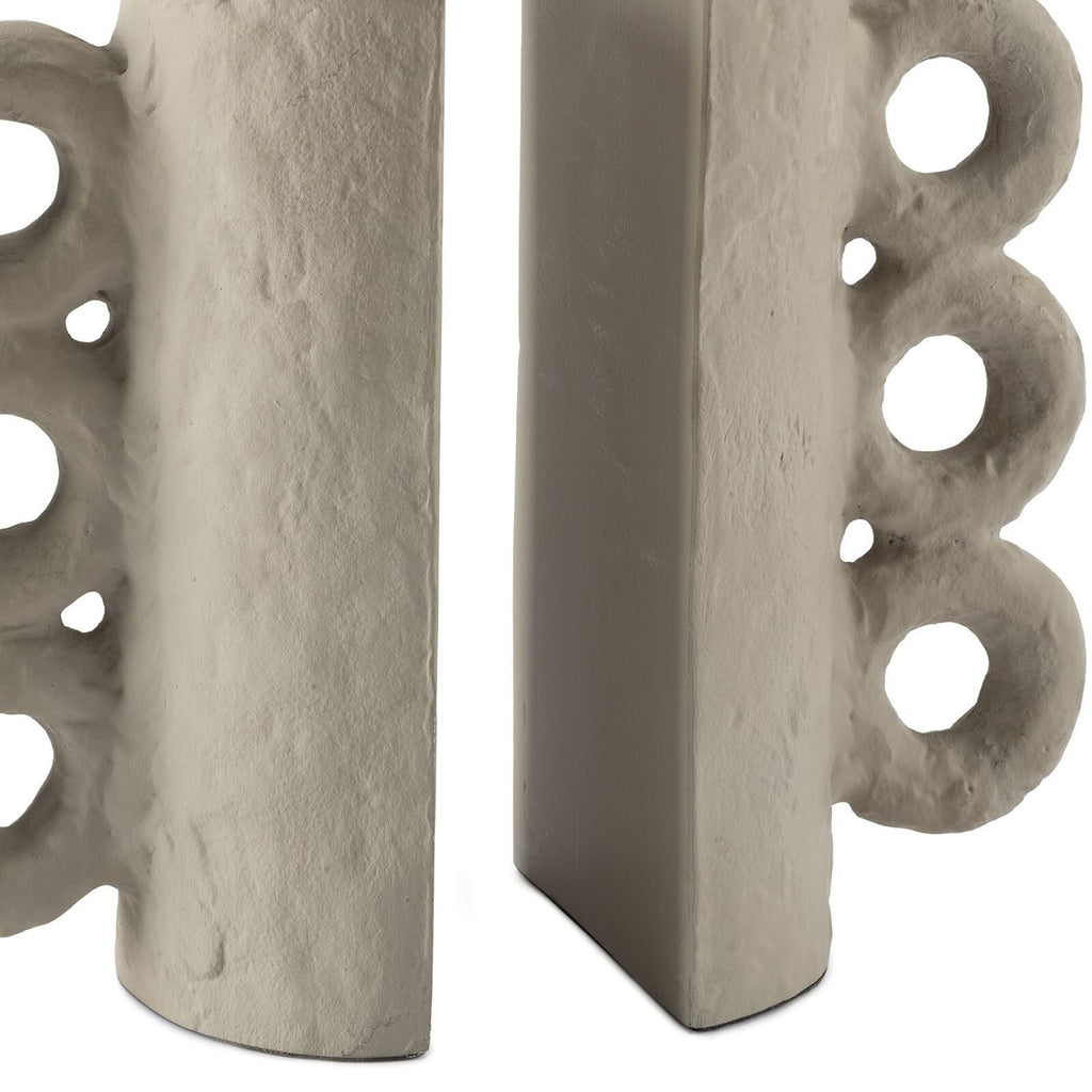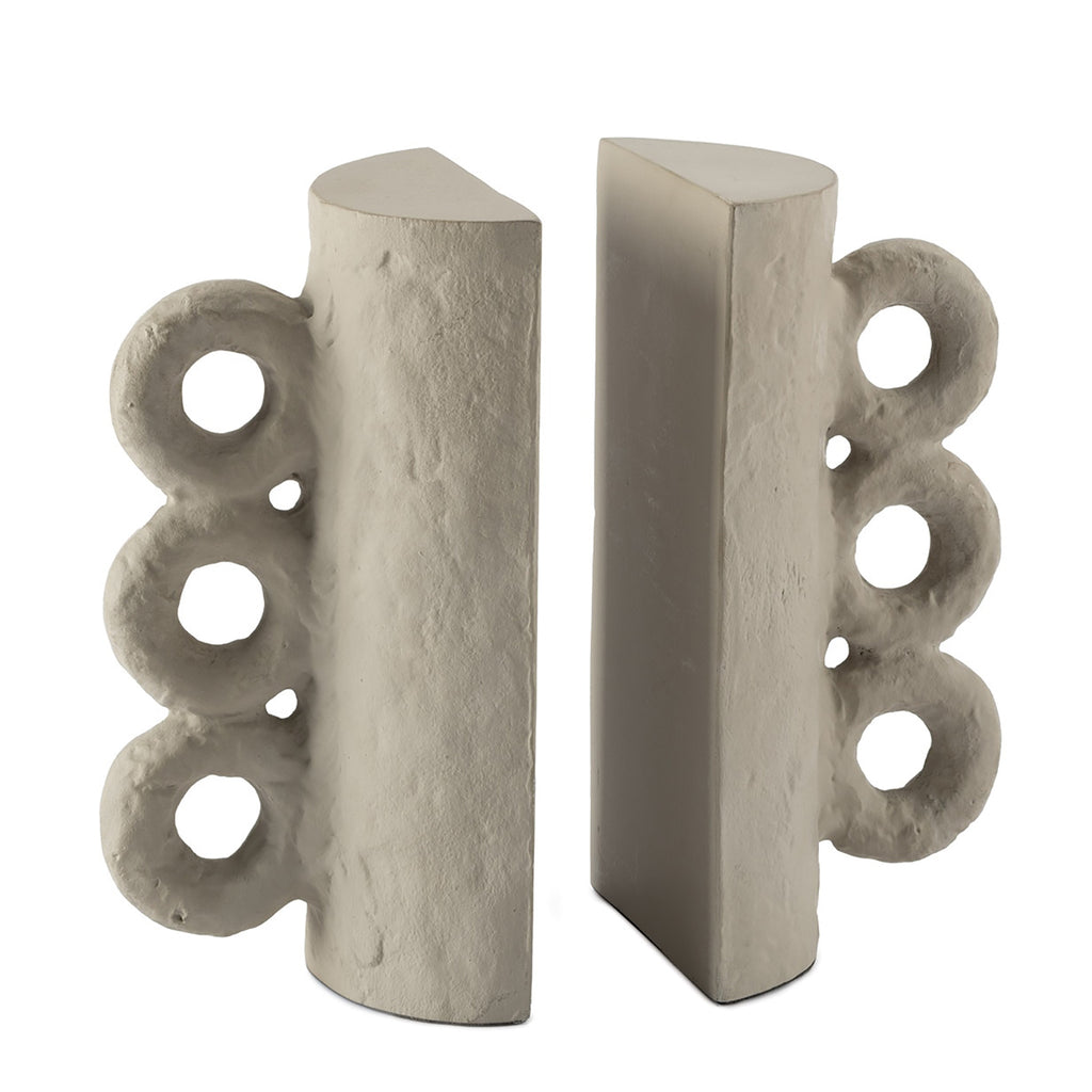 Elevate your decor with the Chandra Bookends, featuring a unique, textured surface inspired by traditional paper mache techniques. Finished in a refined matte brown/grey, these bookends highlight the beauty of handcrafted design. Their artisanal charm and natural elegance make them a perfect addition to any bookshelf or desk, adding a touch of Boho-chic style and sophistication to your eclectic living space.