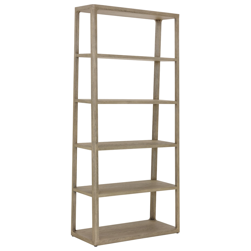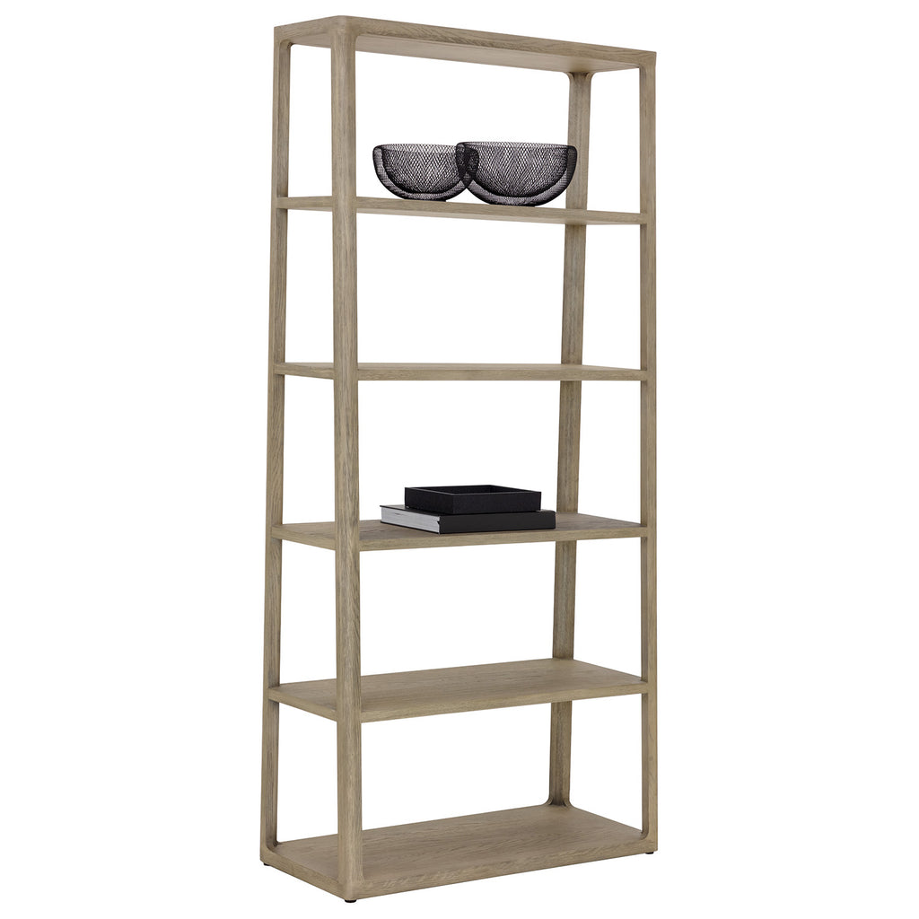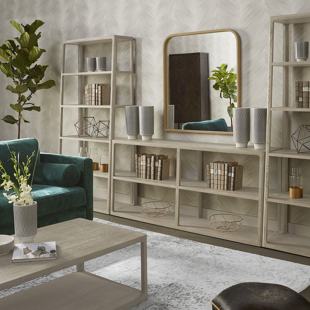 With a clean and modern composition, this large bookcase will add minimalist style into any space. Crafted from a solid oak wood frame with a smoke gray oak veneer.