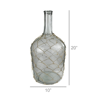 A heavy glass bottles is artfully wrapped in rattan in a lattice pattern creating an amorphous vessel and a statement worthy decorative object.