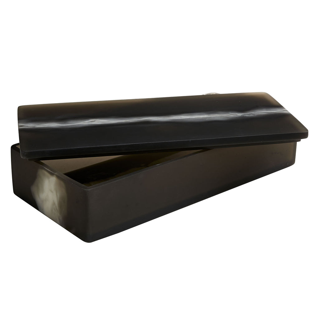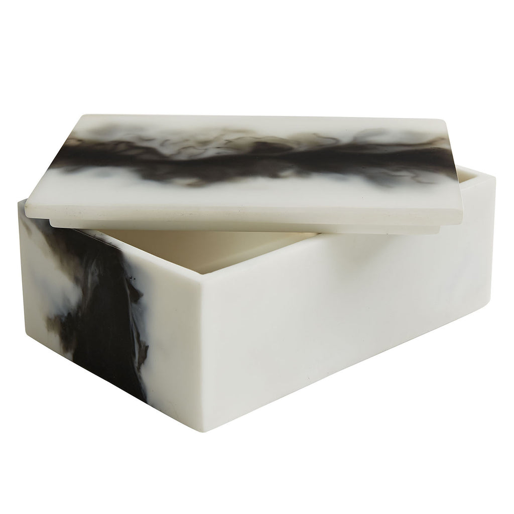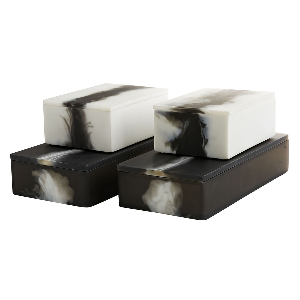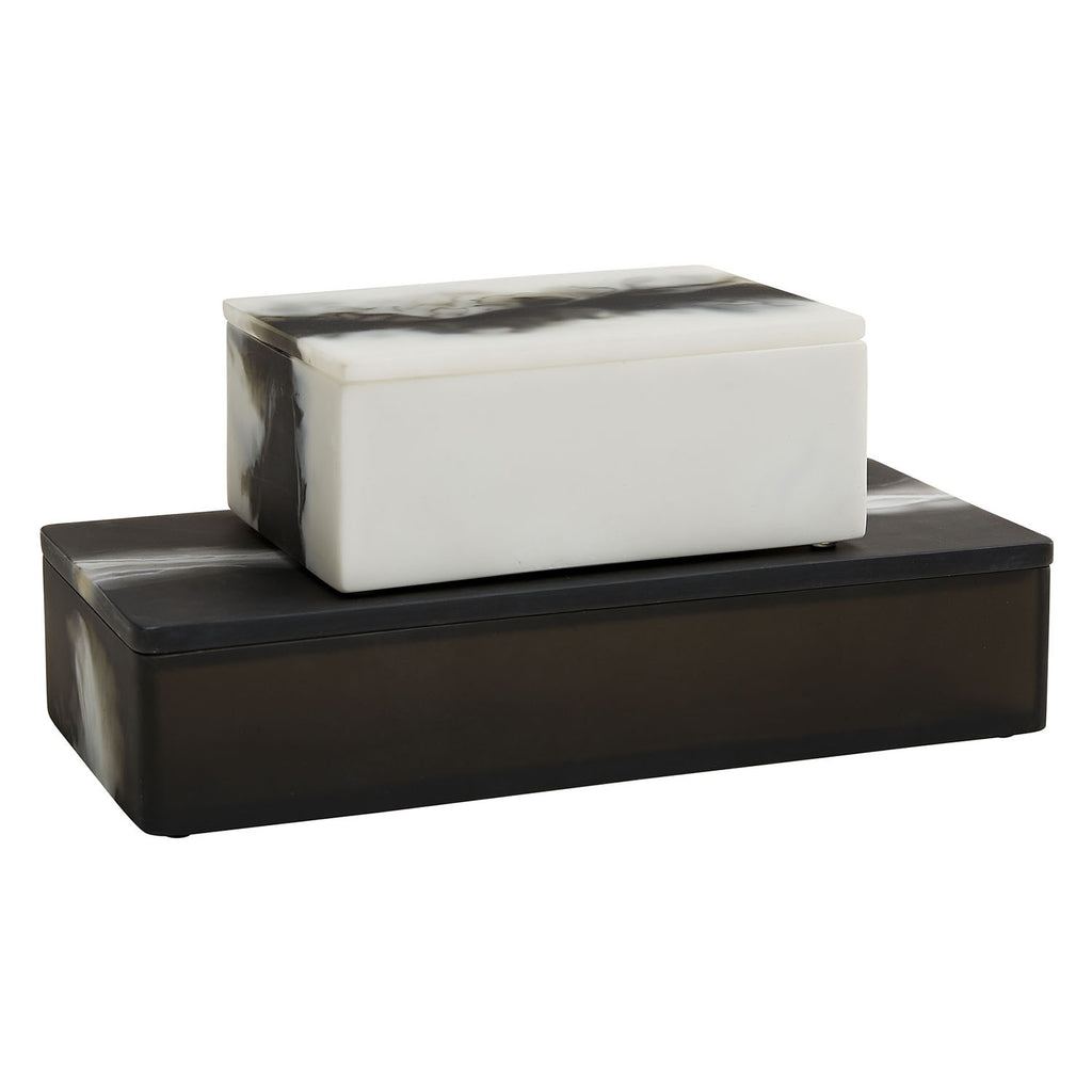 Arteriors Home brings sophistication and style to any interior design project with their collection of decor and tabletop pieces. From the elegant and minimalist to the bold and statement-making, Arteriors Home boxes add an element of charm and personality to any room. Explore the concept of yin and yang in this duo of Arteriors Hollie box set. Black and white combinations sweep large-scale resin foundations, each with its own distinct swirl pattern. One is larger than the other, making for optimal stylish storage for accessories and small items. Perfect for accenting a vanity, desk or bookcase.