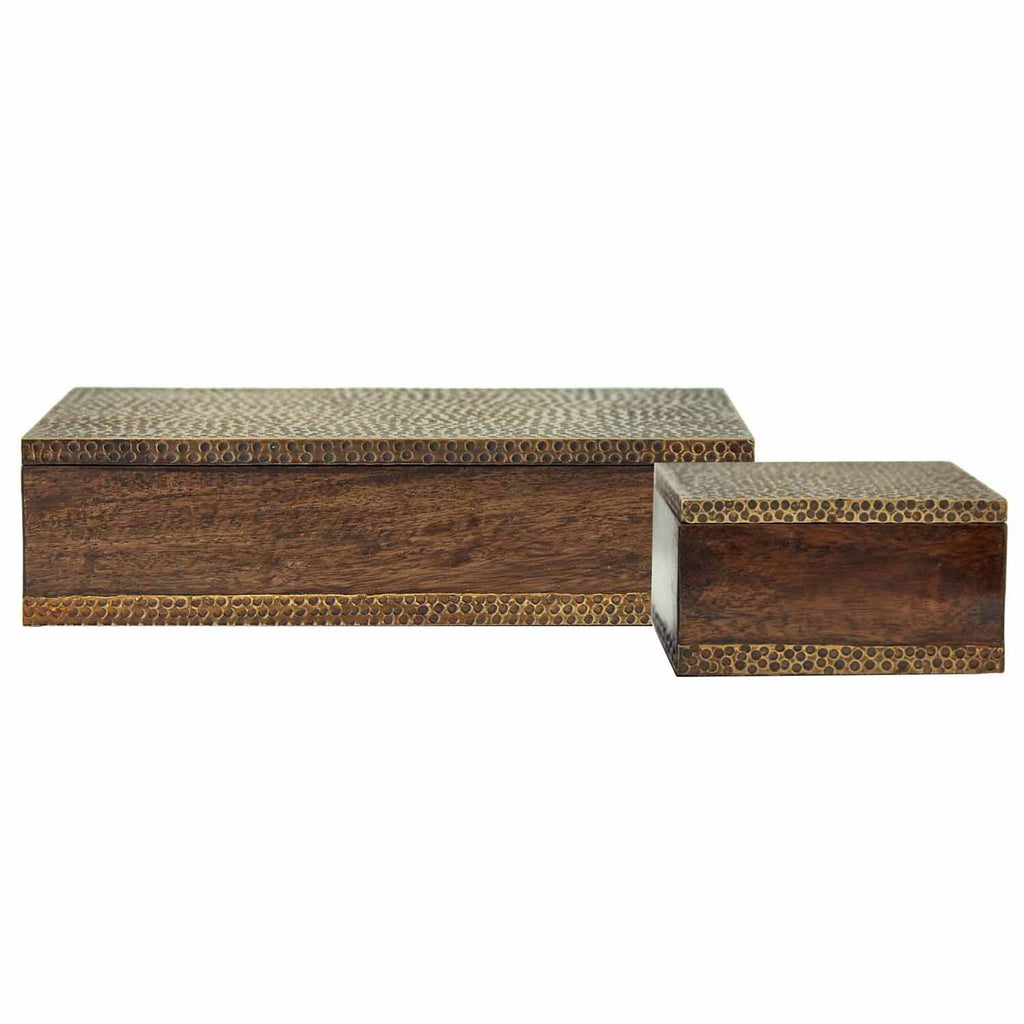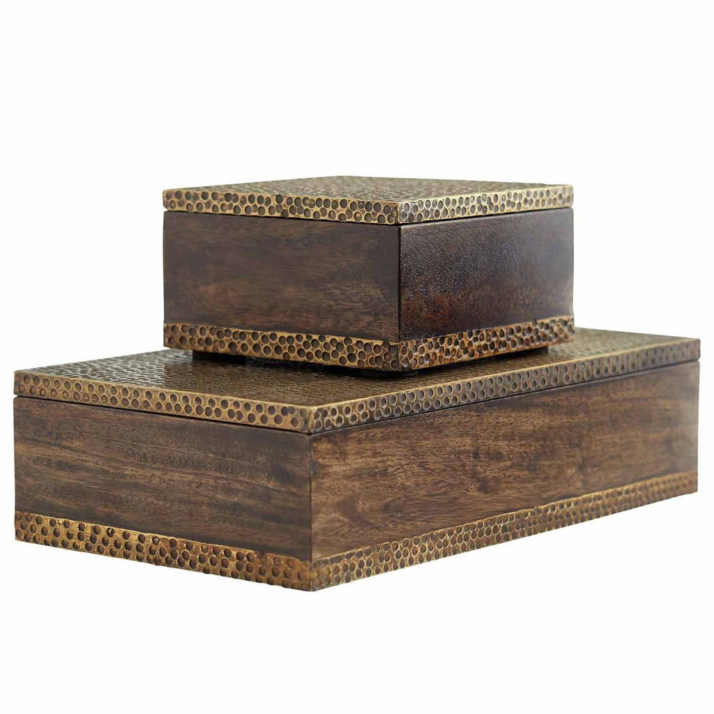 Arteriors Home brings sophistication and style to any interior design project with their collection of decor and tabletop pieces. From the elegant and minimalist to the bold and statement-making, Arteriors Home boxes add an element of charm and personality to any room. Equal parts style and function, the decorative Arteriors Turney boxes make handsome storage accessories. With an unmistakable midcentury sensibility, the boxes are crafted in walnut stained mango wood with a stippled, antique brass-clad plate ornamenting the top of each catchall. Finish will vary.