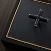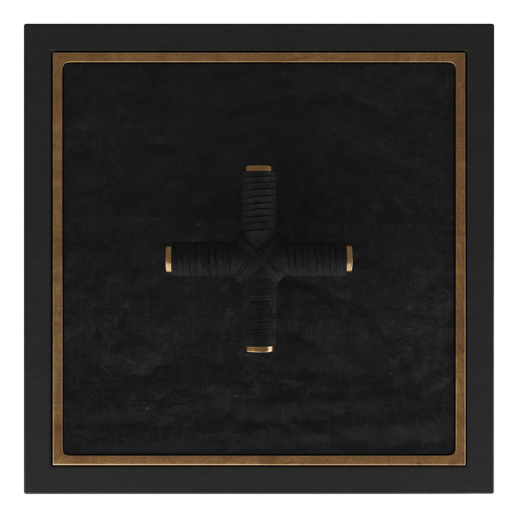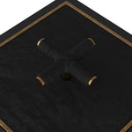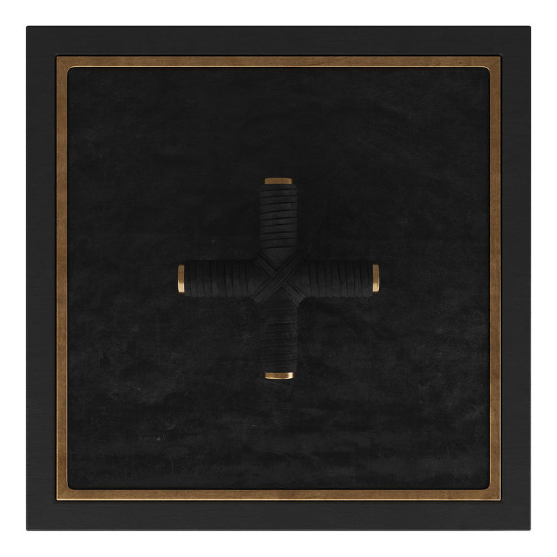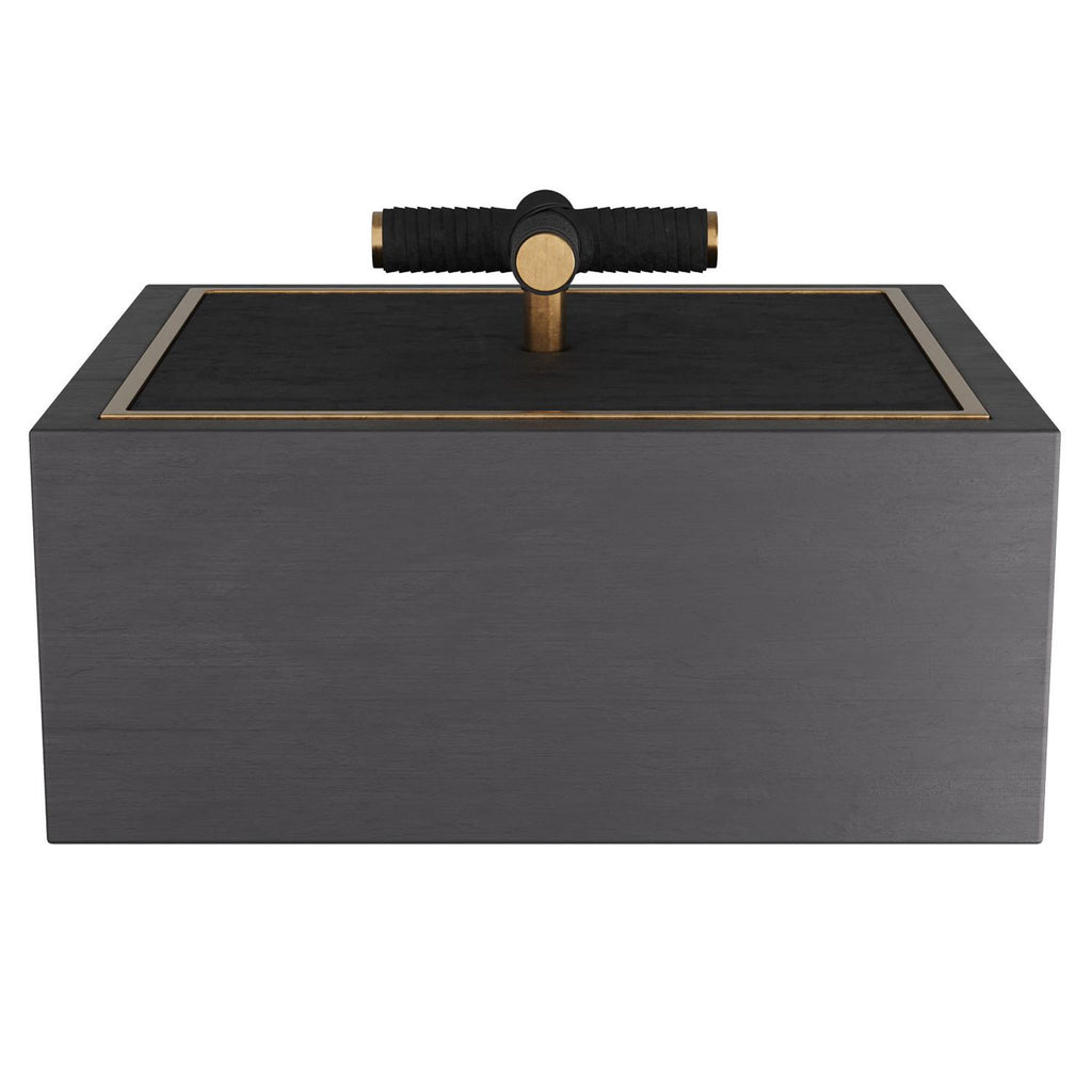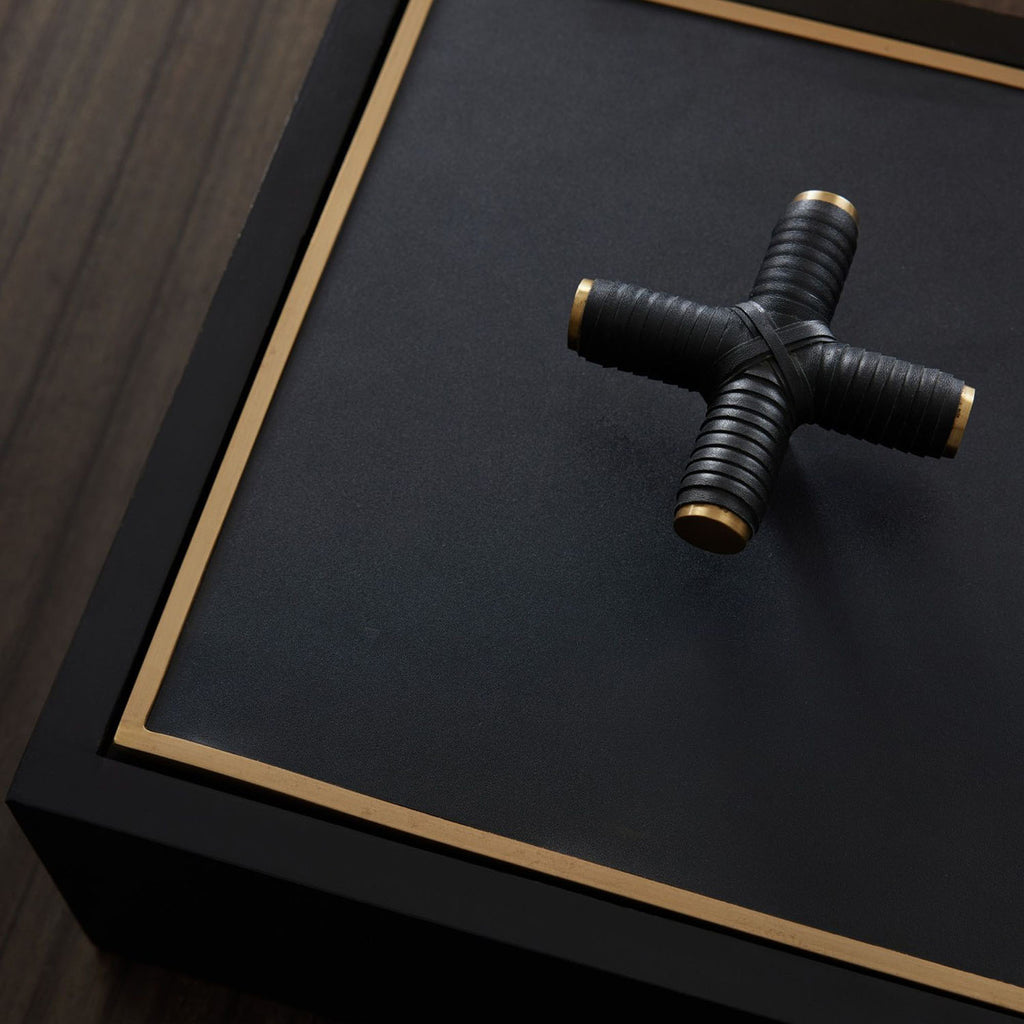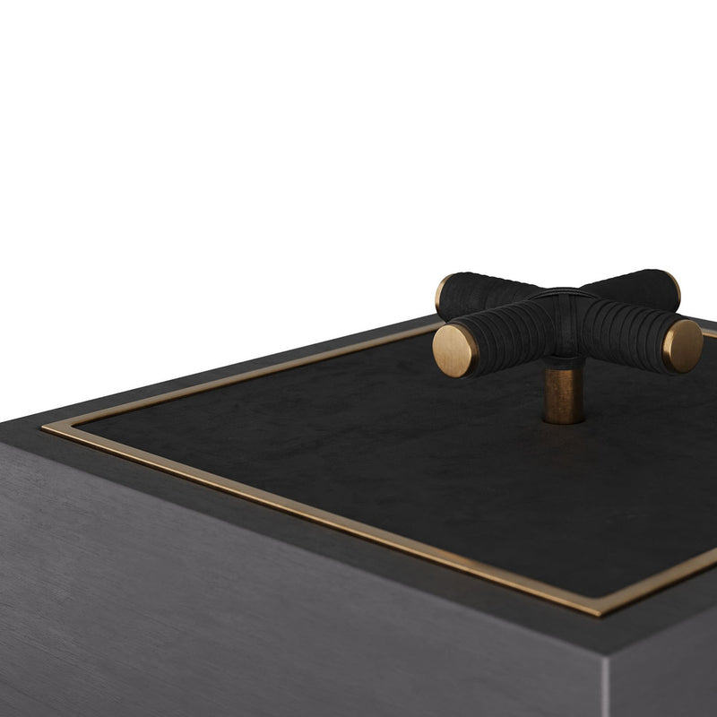 A stylish storage element for any room. The Arteriors Xander Box is made of ebony stained wood with an inset bezel of antique brass. Topped with a beautiful black leather-wrapped brass criss-cross handle for easy opening. Finish will vary.