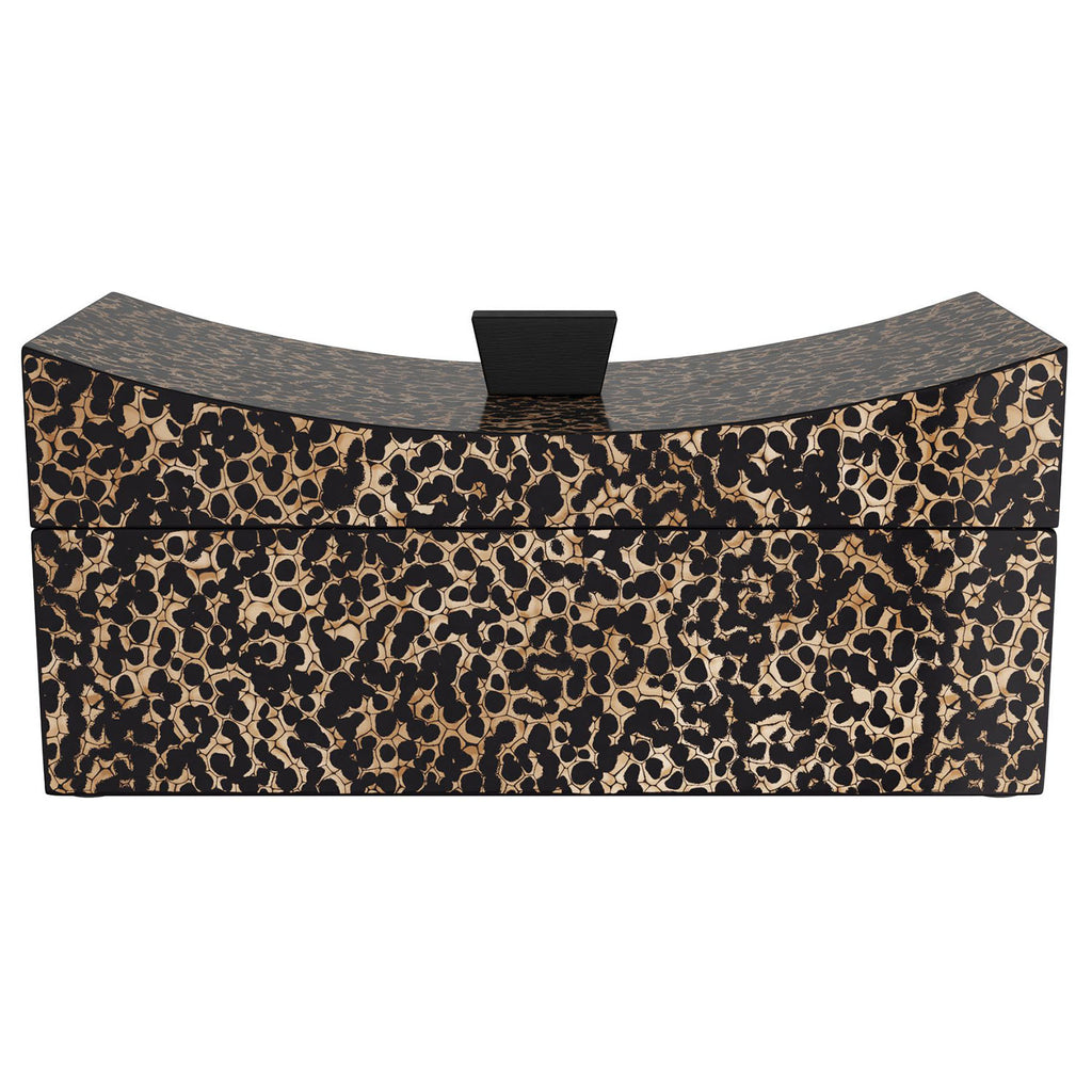Adorned in black and ivory eggshell lacquer with a black lacquered handle, the speckled effect of this elegant box intrigues the eye. Inspired by an ancient chinese empire pillow, the curved lid opens to reveal a black wood interior. Finish will vary.