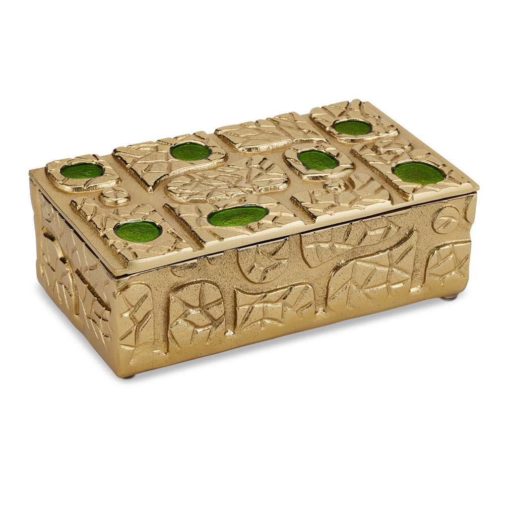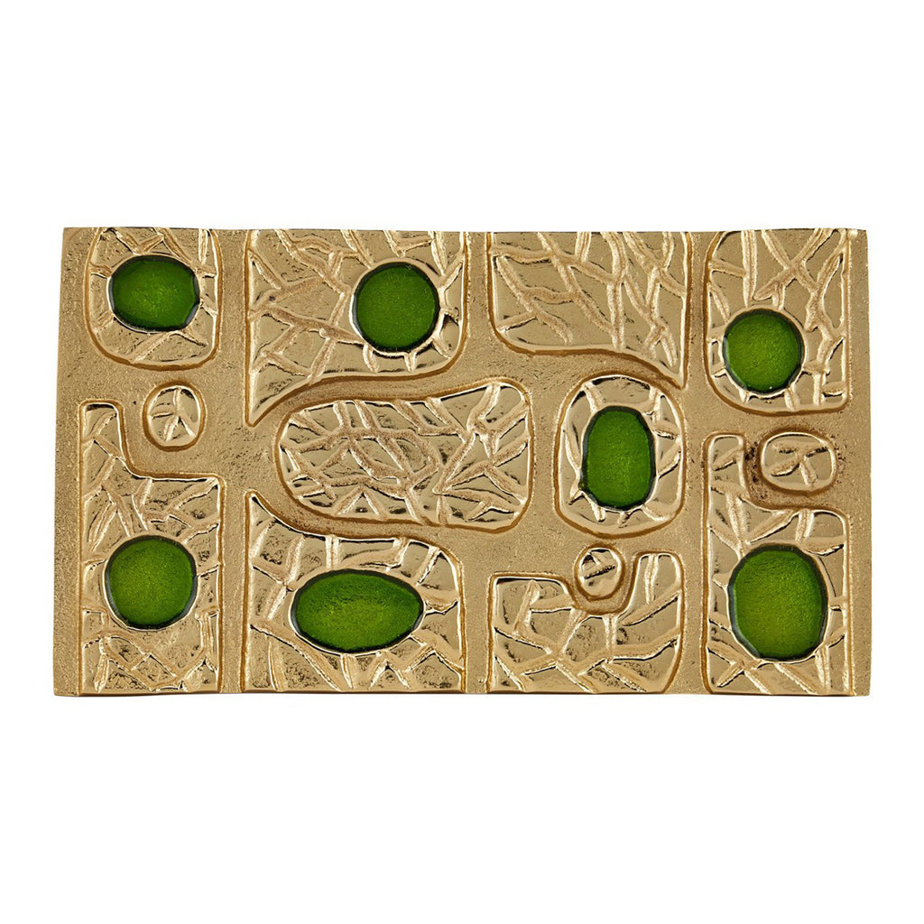 Inspired by a 1940s design, the Currey & Co Beau Monde Gold & Green Box has textural shapes made of cast aluminum in a gold finish, ornamented with green enamel lozenges fitted in place to create a lively pattern running along its surfaces. Inspired by a piece seen at a French flea market, the gold decorative box is lined in black fabric. For dry use only.