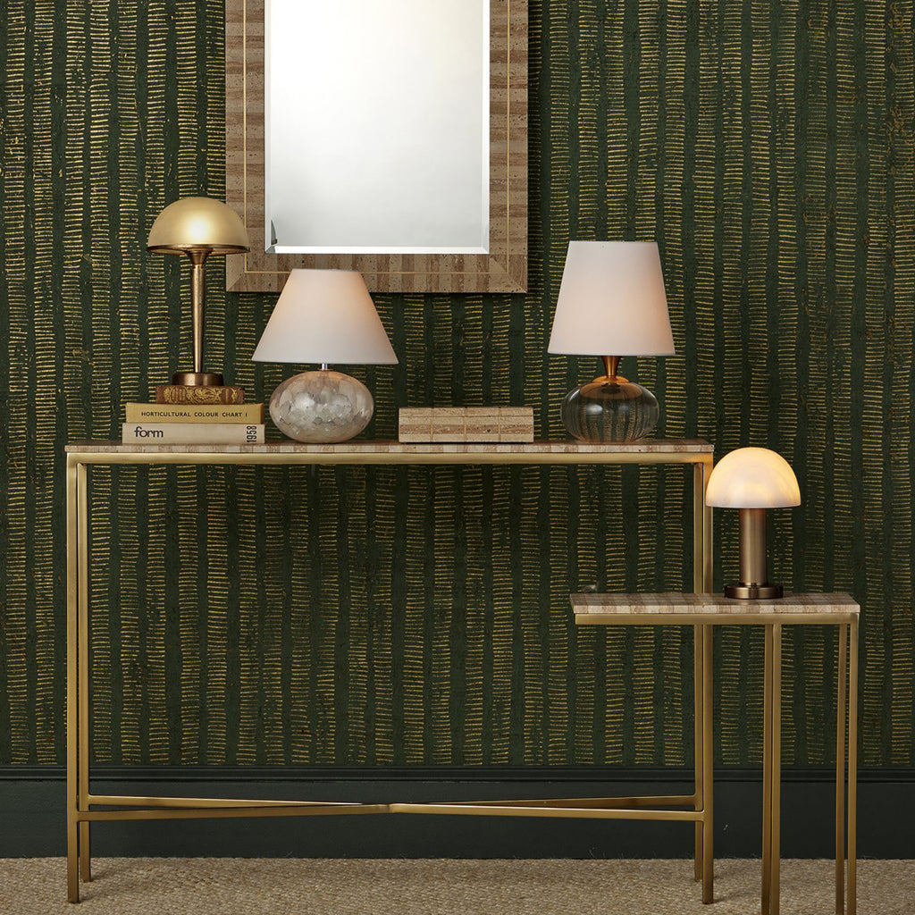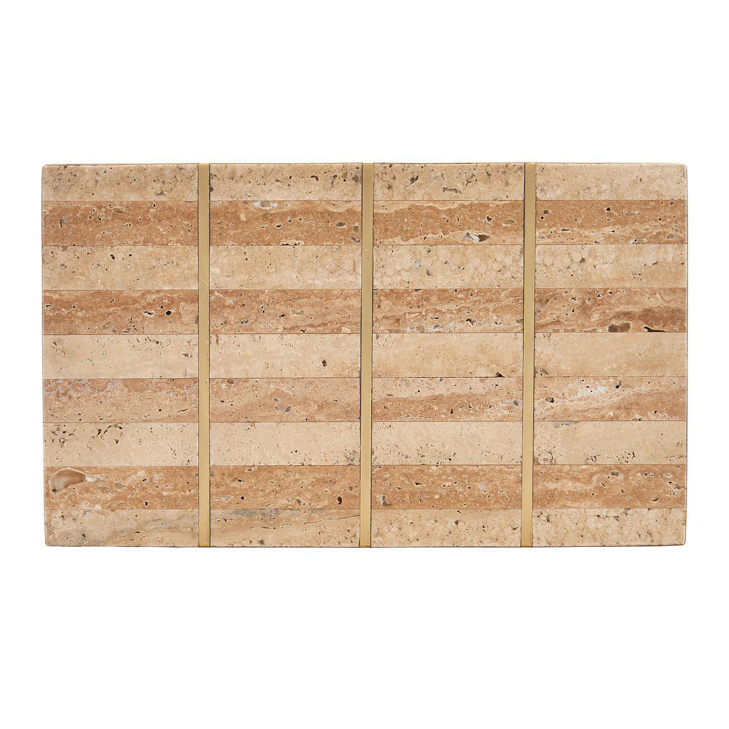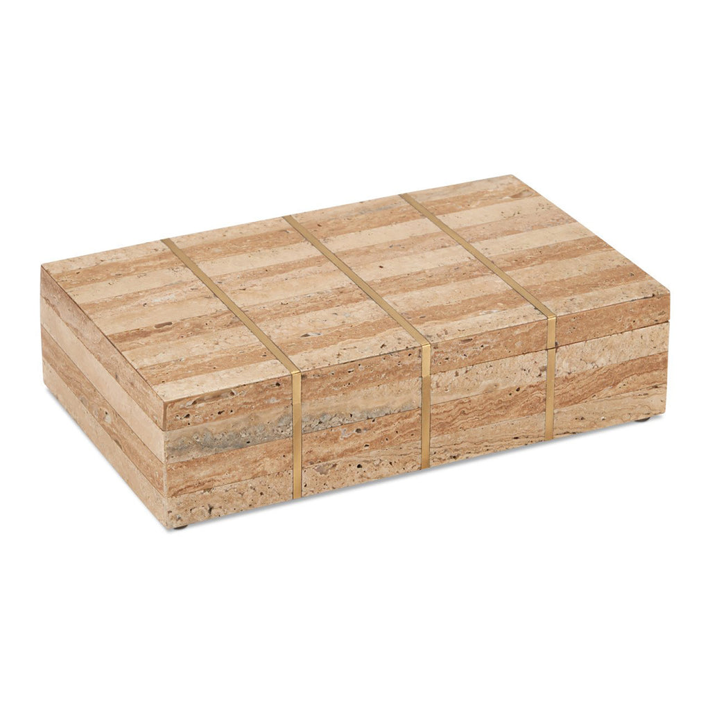 The Currey & Co Dezi Box is made of natural travertine tiles arranged in a stacked dark-and-light pattern with brass inlay running through them. The effect of the intermingling of materials is a pop of brightness as the light hits the metal and a hint of warmth as the stone absorbs it. The surfaces of each decorative box will vary slightly, given the natural material from which they are made.