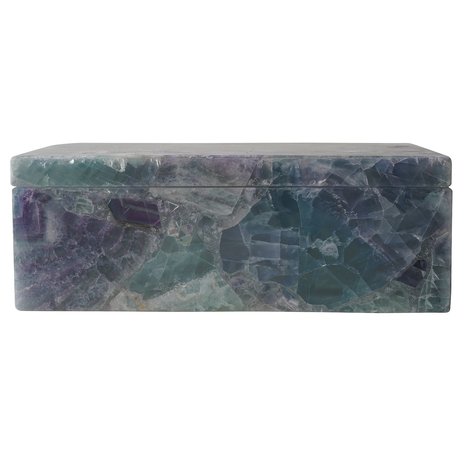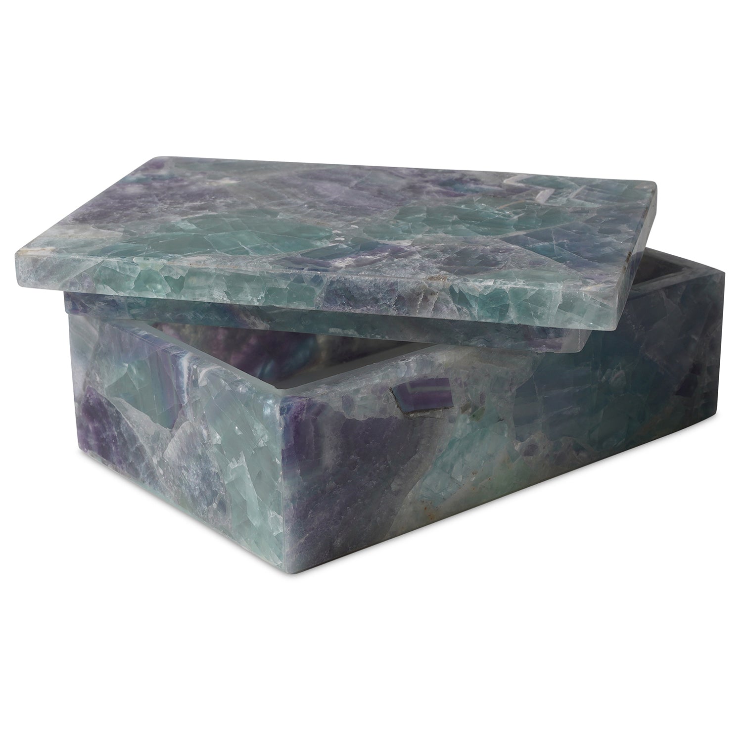 The Currey & Co Fluorite Box is a luminous decorative box made of stone. The name was inspired by the solid Fluorite panels that are glued together to create this accessory with an abundance of sheen, thanks to the iridescence of the natural material. Because this is an elemental piece, there will be significant variations from box to box, some leaning toward purples and pinks, while others will have hints of green mixed in. The inside of the box has been honed so it is smoother while the outside is matte.
